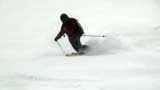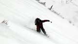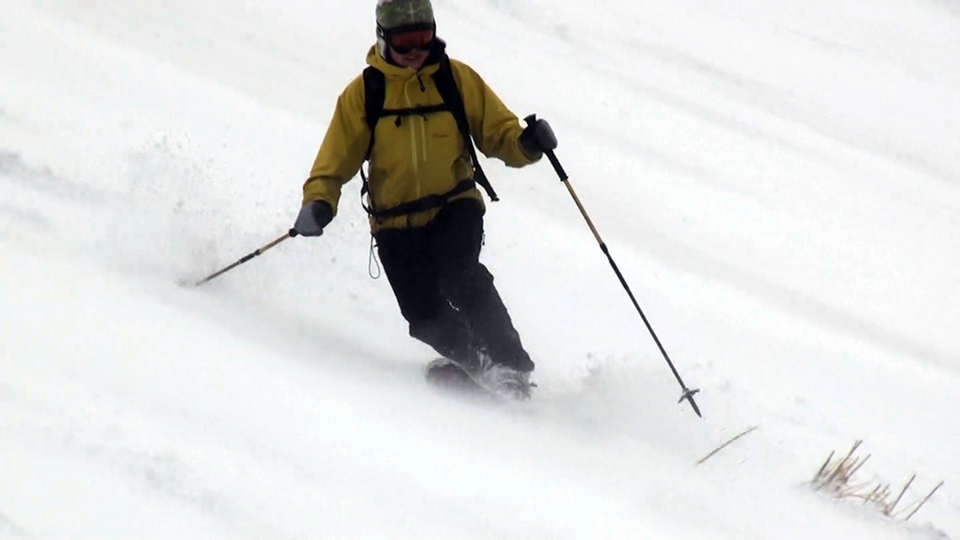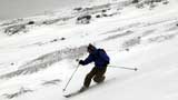 滑ってみると、黄砂混じりのハードバーンの上に締まった風成雪が縞状に残っているという、難しいコンディション。