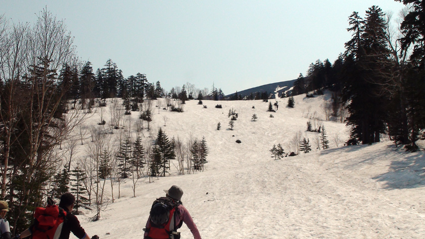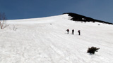 ルートは、山頂まで雪が続いていないので、西の谷を稜線まで詰めることにする。