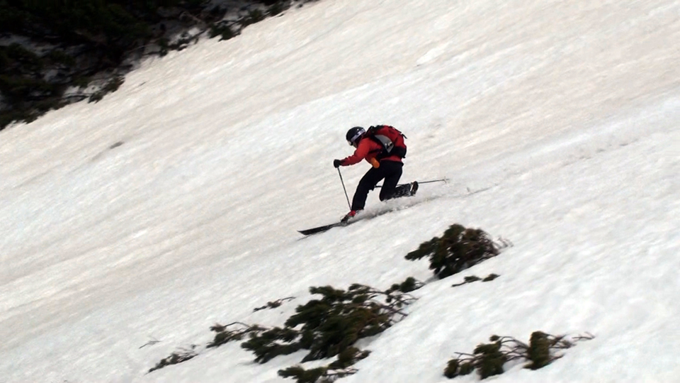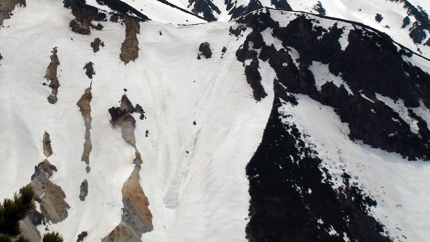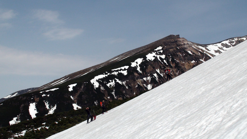 二段目から上では、かなりハイ松が顔を出していた。ただし谷筋には雪がたっぷり残っているので、ルートを吟味すれば三段山はまだまだ楽しめそうだ。
