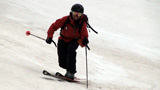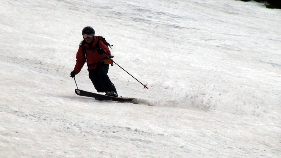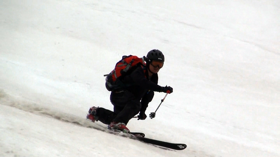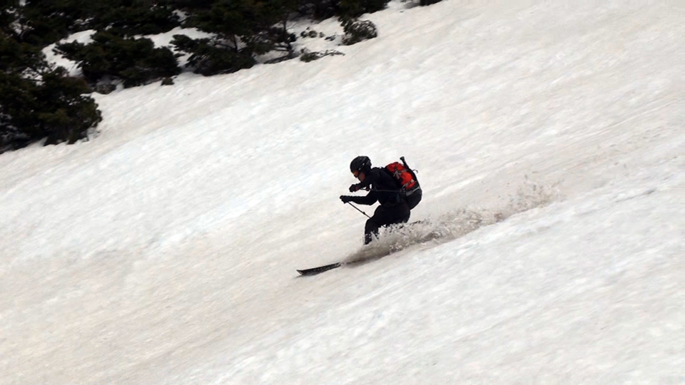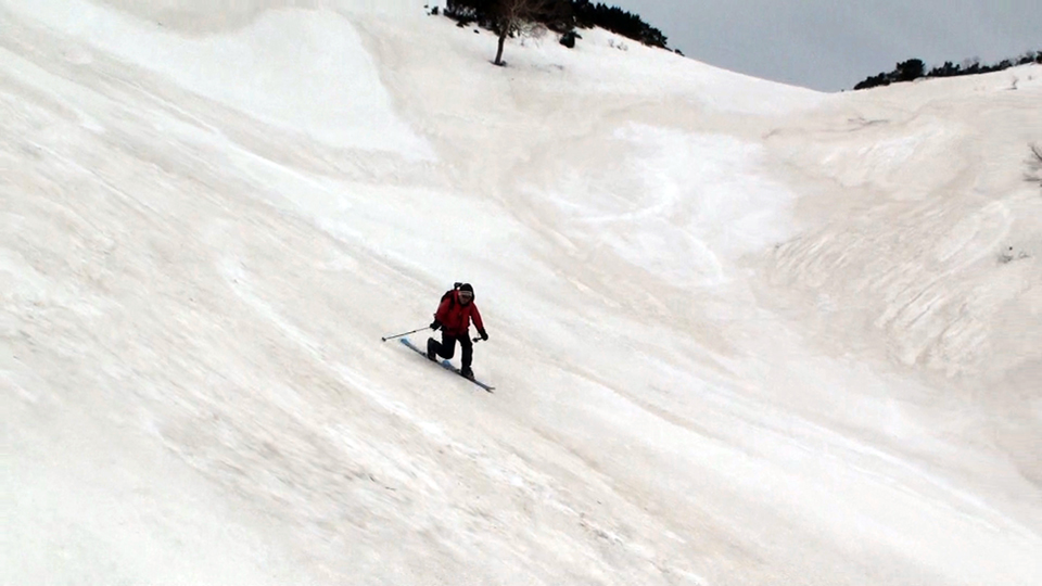 天候が悪化する前にと急いで滑降開始、西の谷の雪は良い感じのザラメ、縦溝や汚れも無く十分に滑りを楽しむことができた。