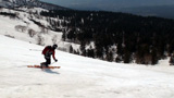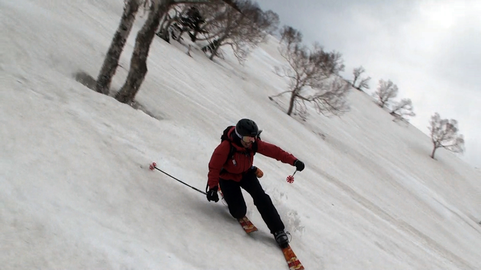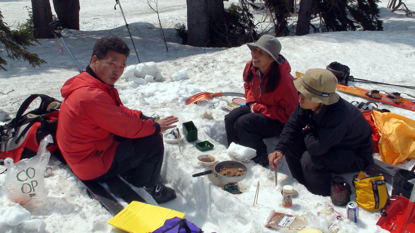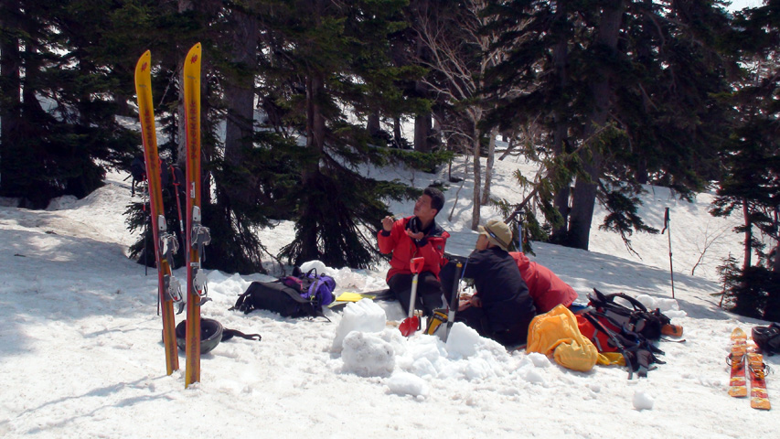 たっぷりの焼き肉にたっぷりのビール(非運転者のみ)を楽しみ、その後西の尾根へ登り返して再度滑降。こちらのコンディションも上々。ただし一段目付近は汚れていて手強いストップ雪だった。いわゆる妖怪「板つかみ」の巣窟。