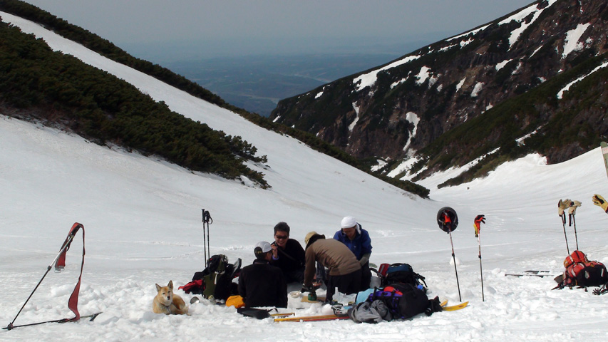 斜面の途中で無線機を落とし、回収のために登り返した大西を待つために、残りのメンバーがそのままボトムで焼き肉を準備してくれた。