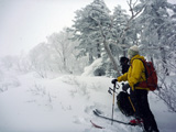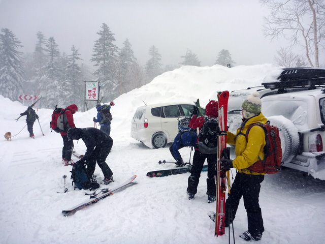 入山口で、退却してきた単独行のかっちゃんと出会った。樹林帯下部ですでに雪が風でパックされていてラッセルが重たく、おそらく滑降できる斜面のコンディションも悪いのではないかとのこと。