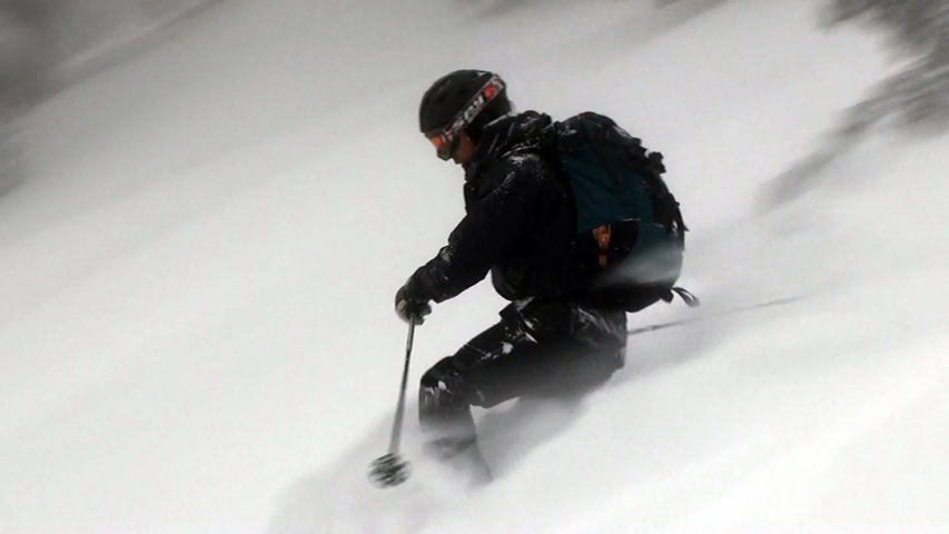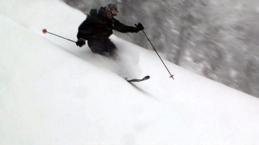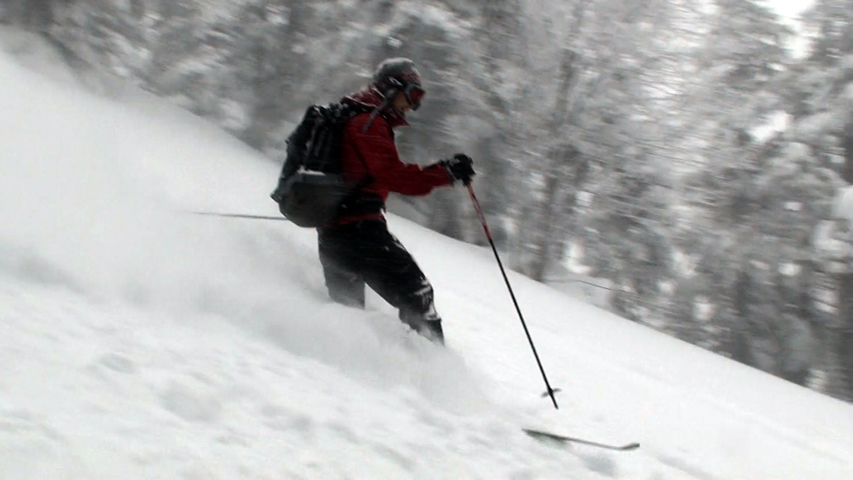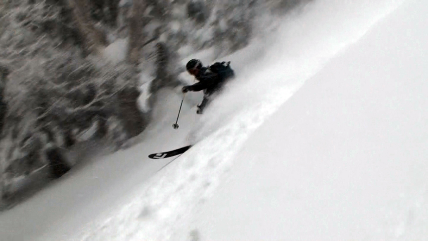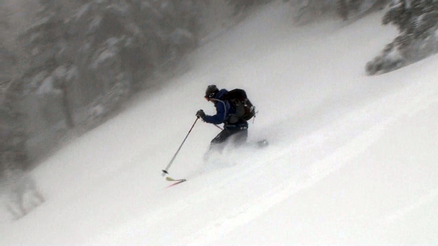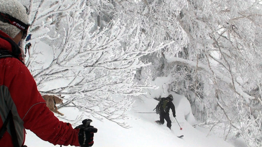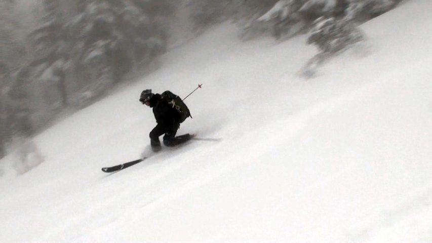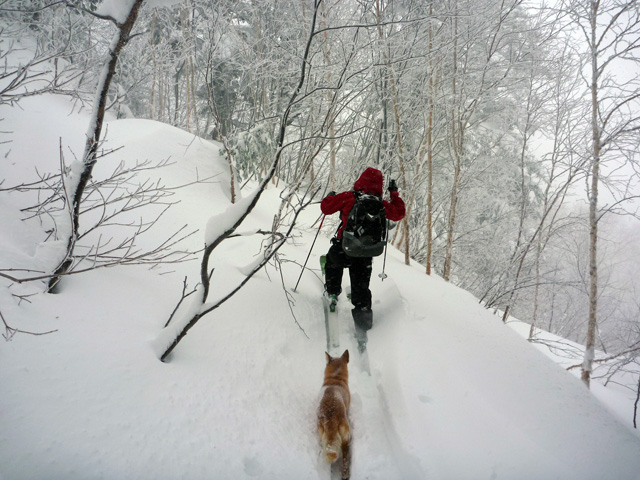 別パーティと別れ(ラッセルありがとう)、標高1,300m付近から西斜面に侵入して樹林帯の滑降ラインを探したら、多少パック気味だが比較的良い雪の斜面を見つけることができた。ファット板なら、この程度の雪質を滑るのは楽勝だ。