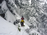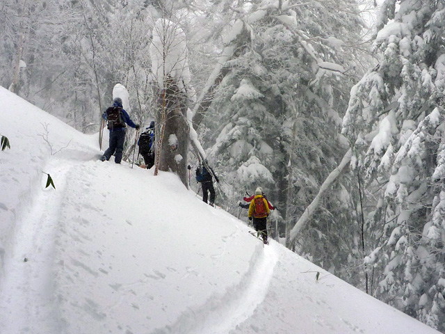 登ってみると確かに雪は重たかった。しかし前回よりもかなり積雪は増えていて、コース取りが楽になっていた。ノートレースの斜面をラッセル交代しながら順調に登る。後方からもう一パーティ追いついてきたので、共同でラッセルすることにした。こういう時は人数が多いと助かる。