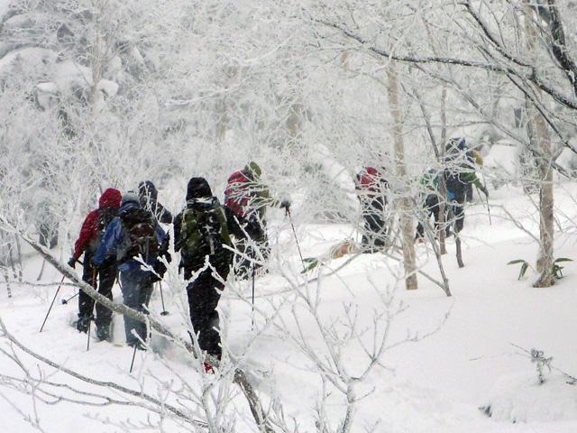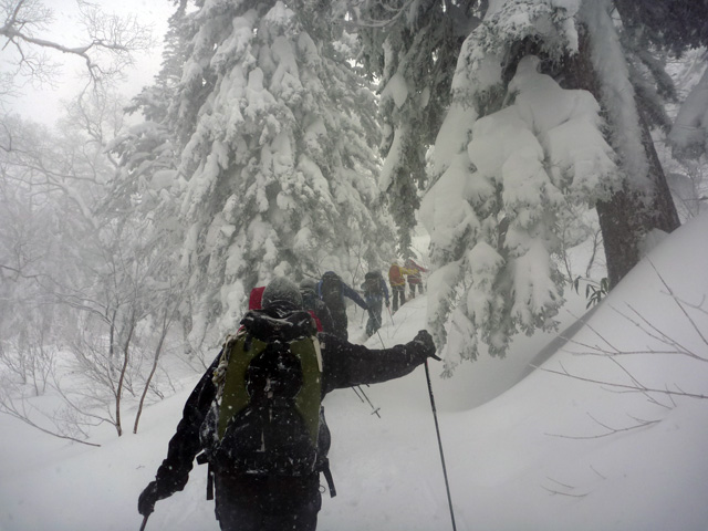 やや絶望的な気分になるが、こちらは人数が多いのでラッセルは大丈夫。問題は滑降する斜面の雪質だが、最悪でも尾根上の樹林帯を下れば良いと考えて出発決行。