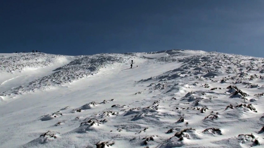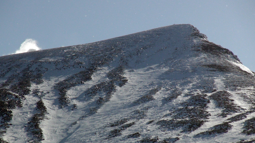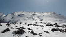 前十勝のクローズアップ ハイ松が露出し、雪面も凸凹・・