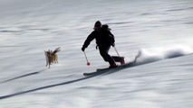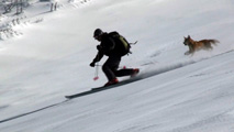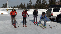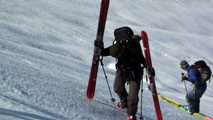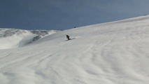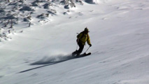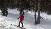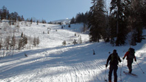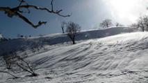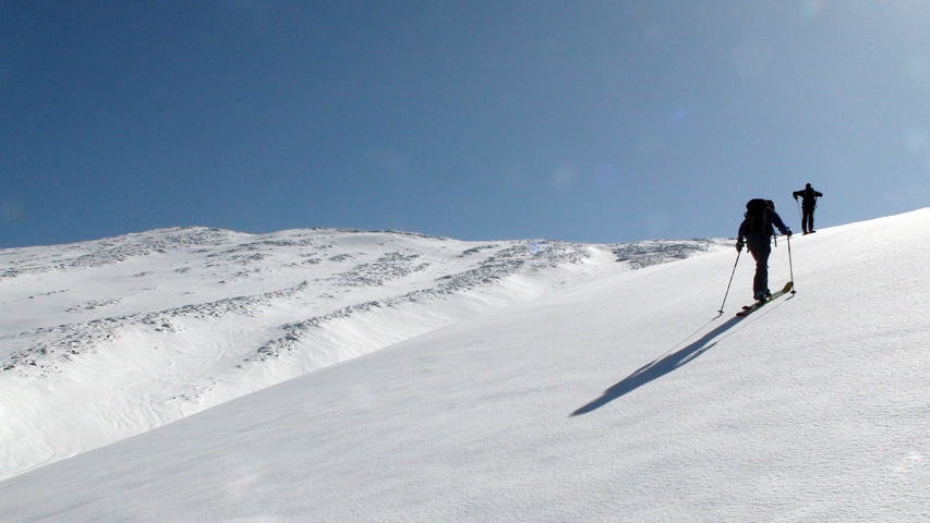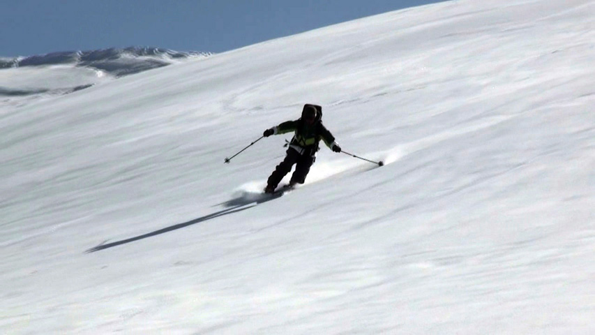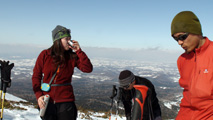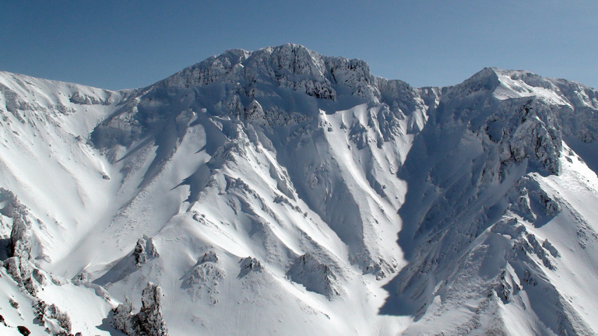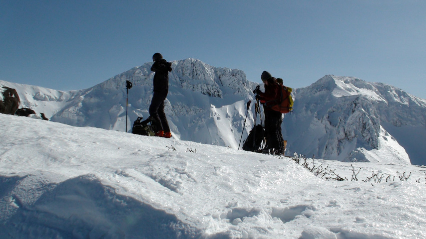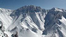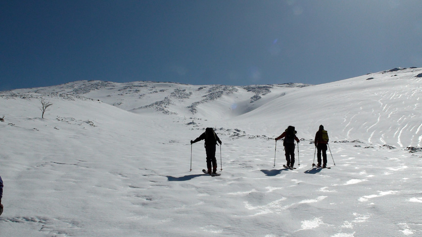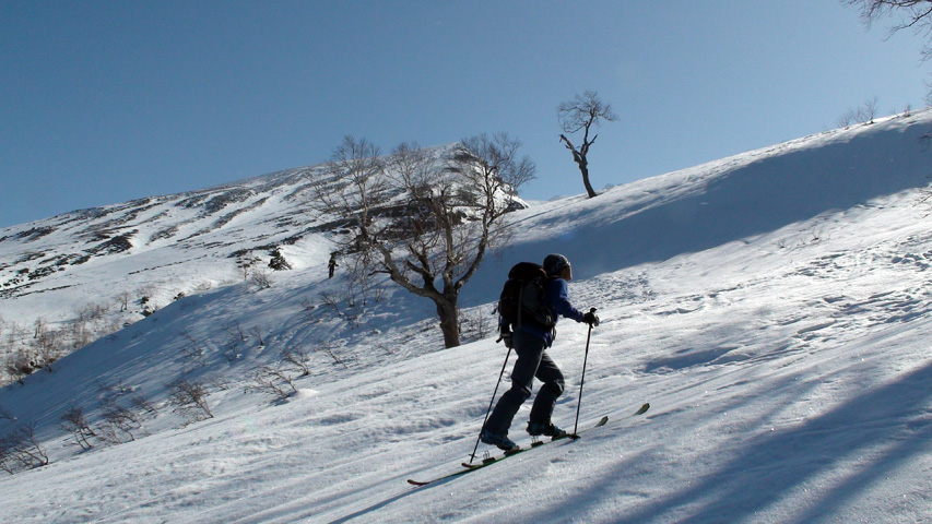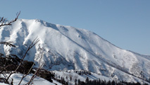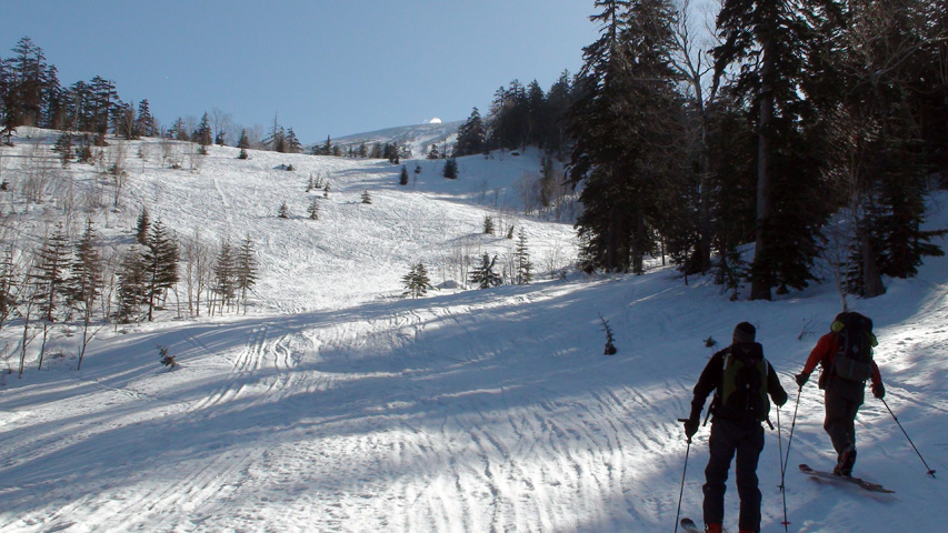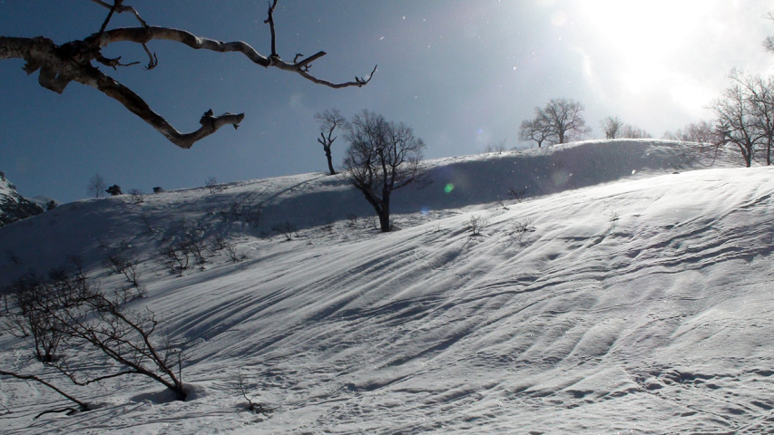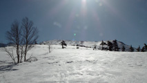 白銀荘によると、昨日朝は気温4度で雨。その後気温が急低下したということで・・山は全て氷に覆われていた。 しかも、雨の流れた縦溝付き。 これは厳しい。登りでもシールが効かず滑落する。 稜線まで上がり、ここで雪が緩むまで待つ作戦を取ってみたが、まったく雪が緩む気配無し。仕方なく滑降開始。 下りもエッジだけが頼りで恐る恐る横滑りで滑降するが、色気を出してテレマークターンをすると縦溝に弾かれて滑落してしまう。 樹林帯に逃げ込むと、こちらもなかなか絶妙なモナカ雪に仕上がっており、さらに落ちてきた樹冠雪が固まってバリケードと化していた。まぁどこにも逃げ道のない状況といったところか・・ 救いは、呆れるほどの快晴。素晴らしい景色。足下がスキーではなく、アイゼンだったら最高の冬山日和だった。 珍しく登り返すこともなく、ヘロヘロになりながら白銀荘に到着。