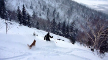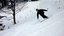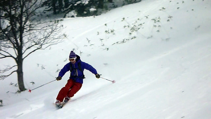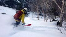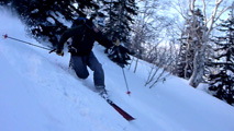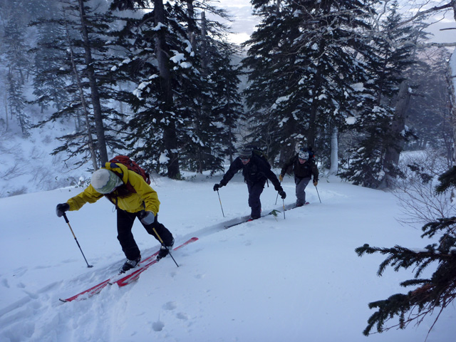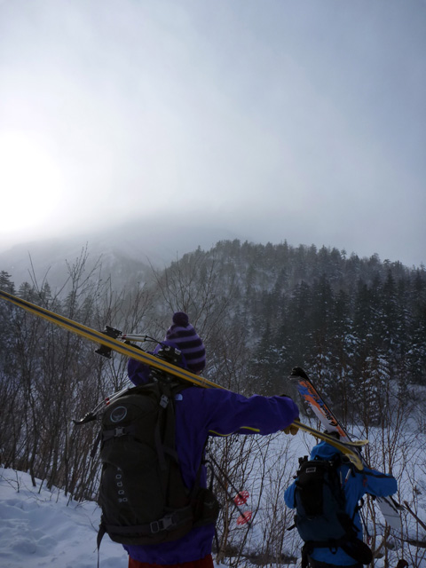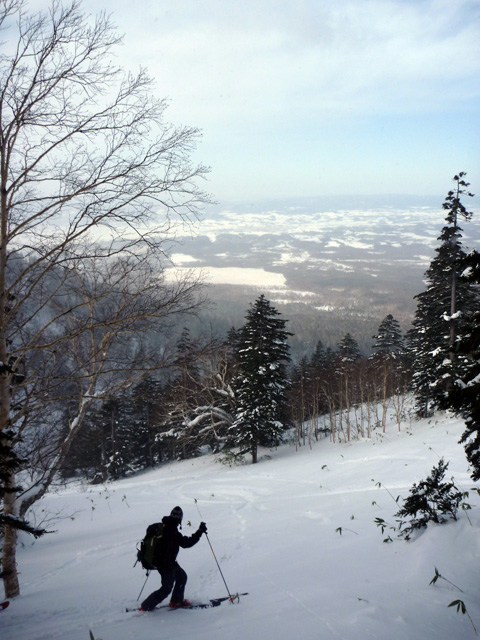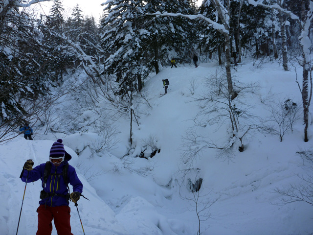 森林限界より上に上がってもまったく良いことは無いので、低めの高度から風下側の二十二林班沢を滑った。