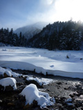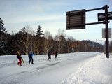 現実は甘くなく、白銀荘前ですでに暴風。樹林の間も風が通り樹冠雪がバラバラと落ちて雪煙が上がっている。こうなると青空が恨めしい。