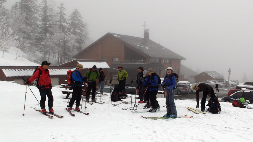 出発時には弱い雨。山はガスで真っ白。まぁこれは想定内なので驚かない。予想通り10センチ程度の新雪が積もっていたので雪質の心配は無さそうだ。