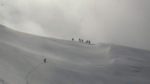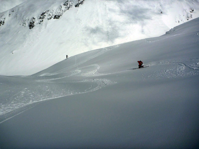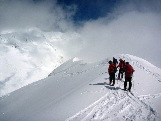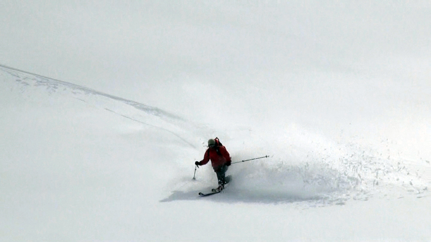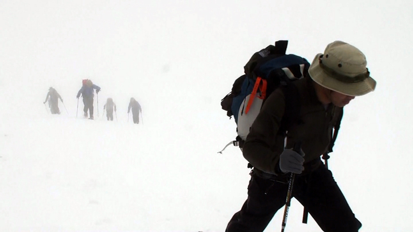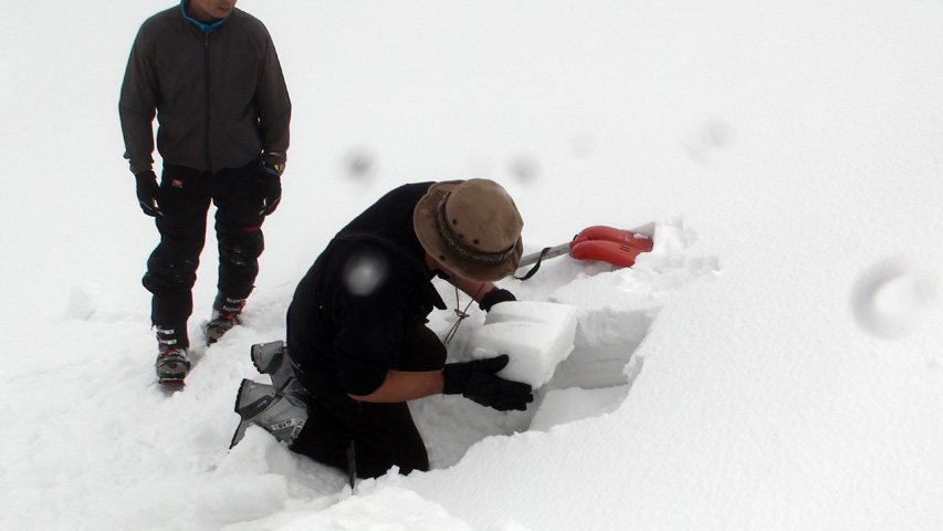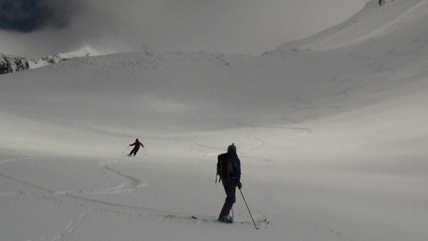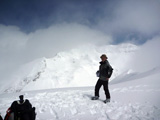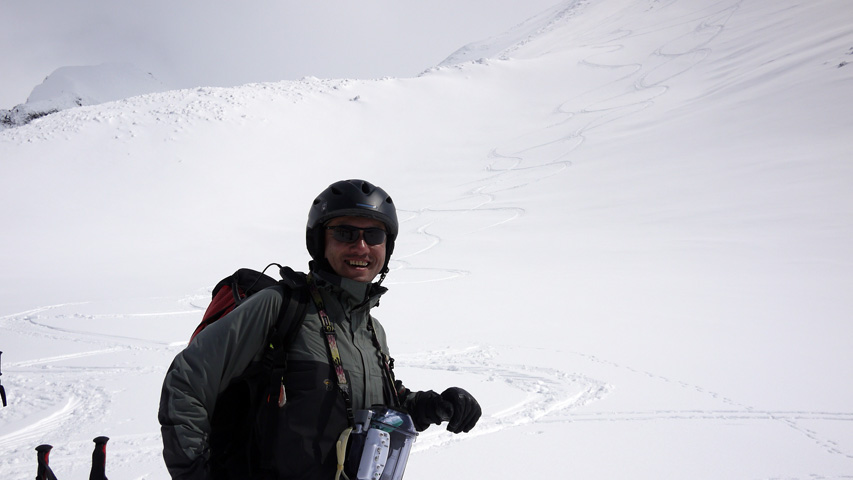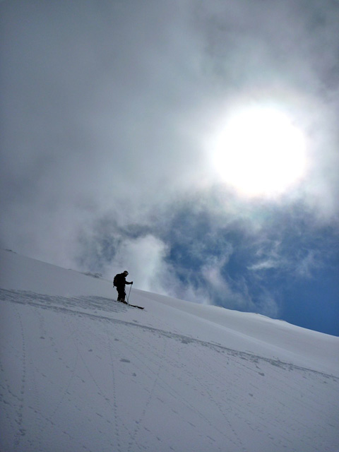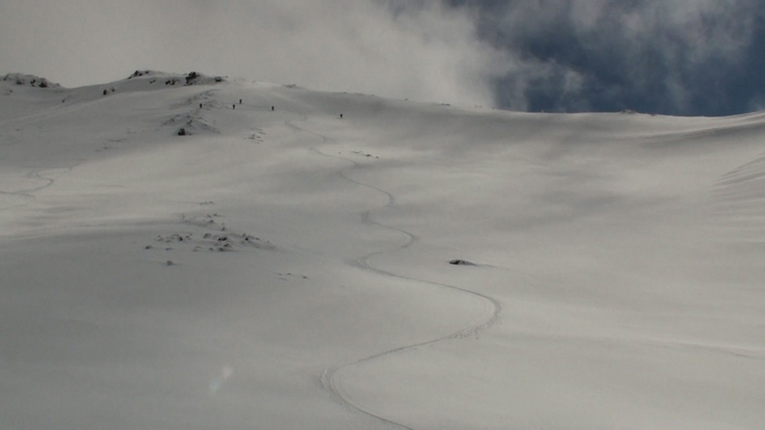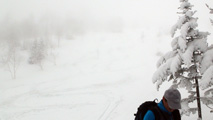さて、お目当てのフリコ沢の弱層テストをして滑降ラインの安全は確認したが、この視界では滑ることができない。私の予想では快晴になるまであと一時間はかかる。