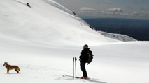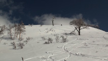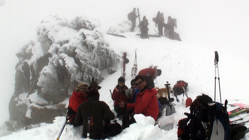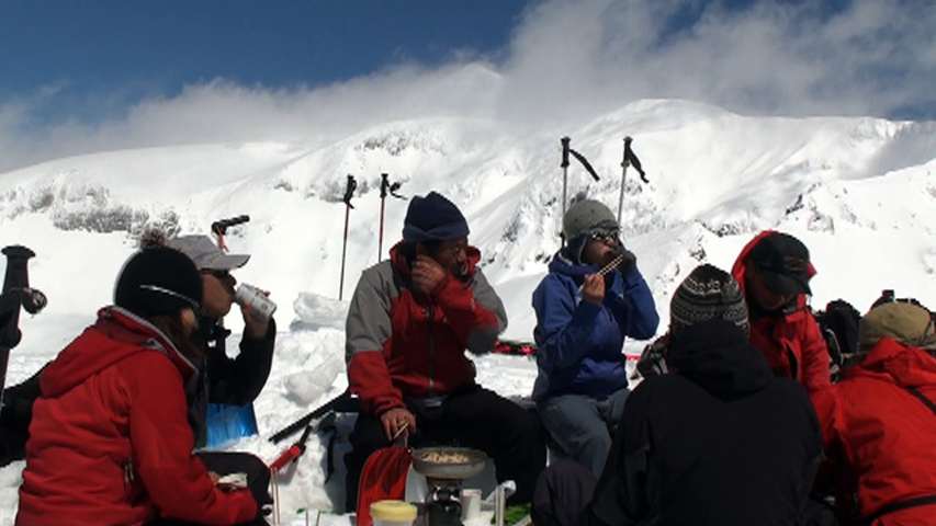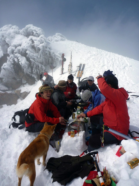 そのうち予想通りガスが晴れ、素晴らしい景観に囲まれての焼肉となった。最高に盛り上がったところでフリコ沢へ滑降開始!あとは画像を見てほしい。 |