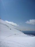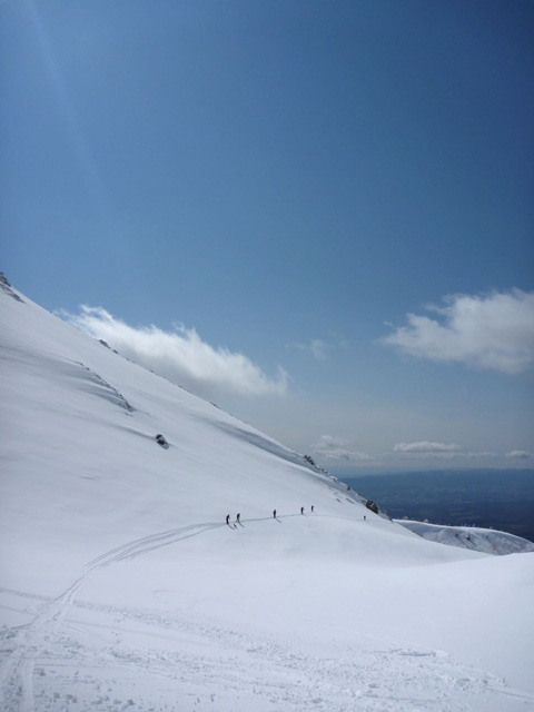 2.登りはガスで雪が腐ることなくコンディションが保たれ、焼肉〜滑降する頃には快晴・無風となる。