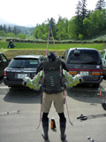 駐車場で、Web「ただ乗り」のH本さんら一行と遭遇!彼らも前十勝を滑るという。さらに後続のパーティもあり、この時期には珍しい賑やかなツアーとなった。