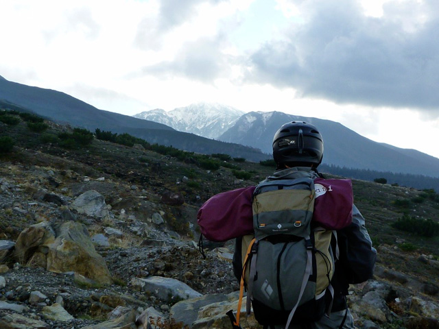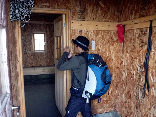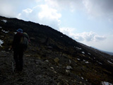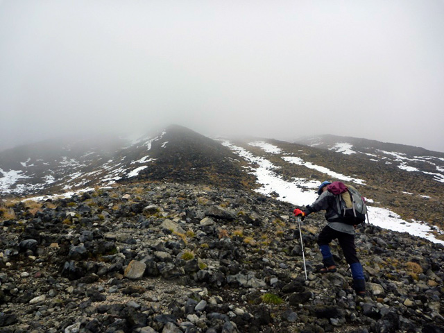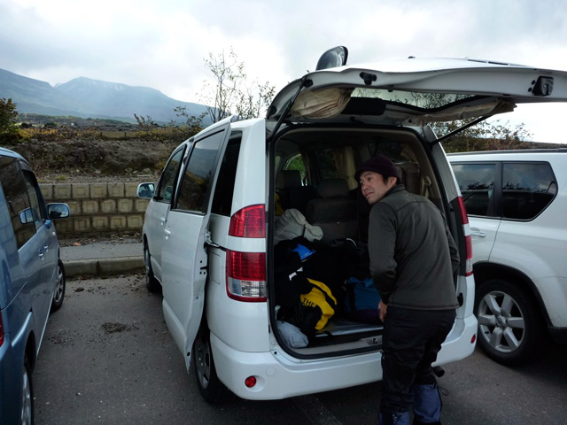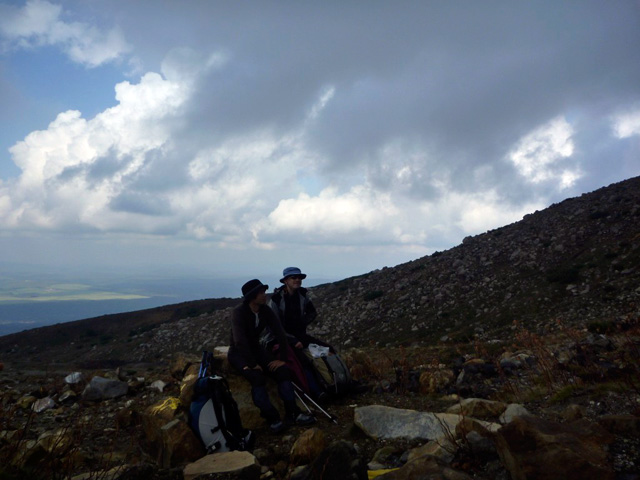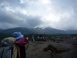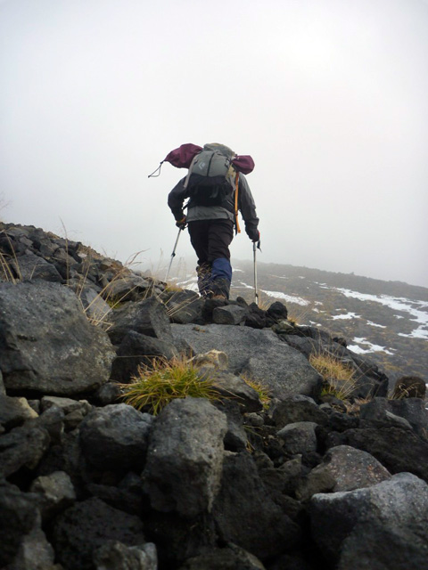 雲の下からうっすら見えた雪筋を求めて、十勝岳避難小屋から大きくコースを逸脱し、廃道となっている前十勝ルートを上がる。