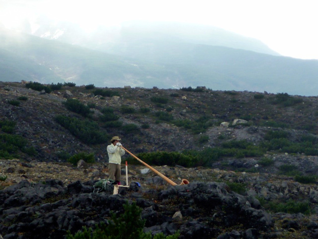 意外と気温が高く、間もなく完璧な冬山装備のおかげで大汗をかき始める。周囲に雪は全くない。ひーこら言っていたら、なにやらホラ貝のような音が聞こえてくる。これは・・アルプホルンだ!