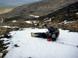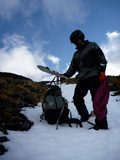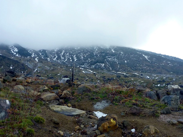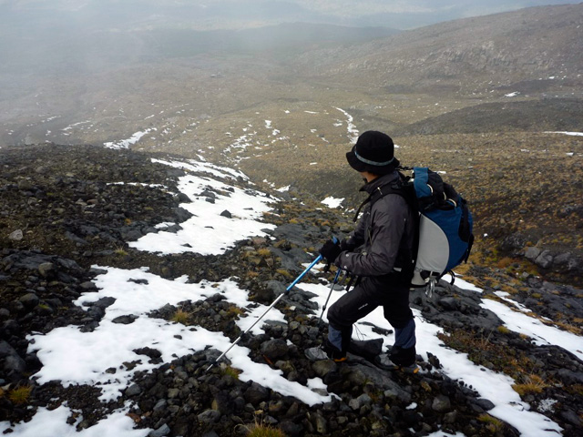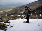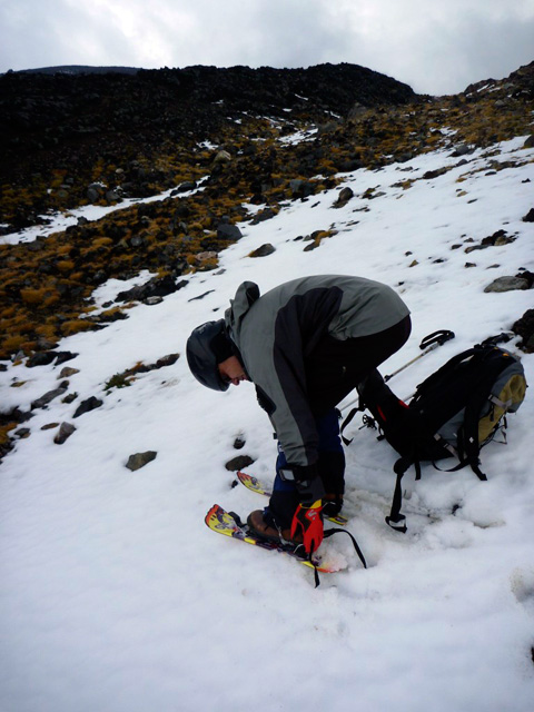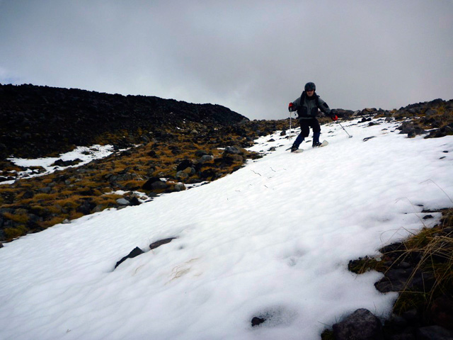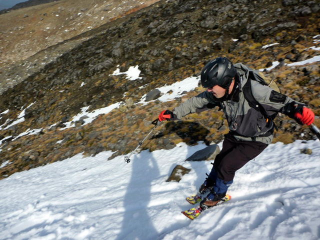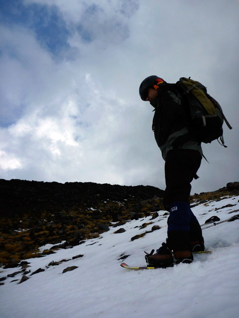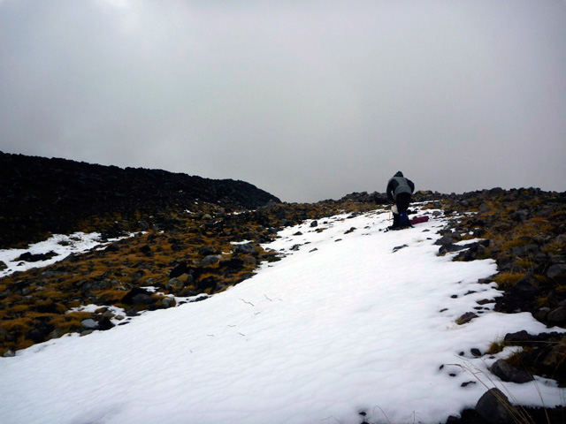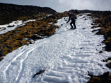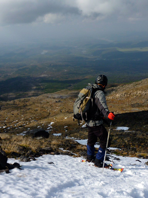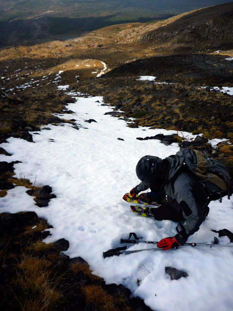 硫黄採掘の索道跡を通過し、ボウル斜面へトラバースしていく途中で、やっとささやかな雪筋を見つけることができた。
