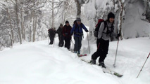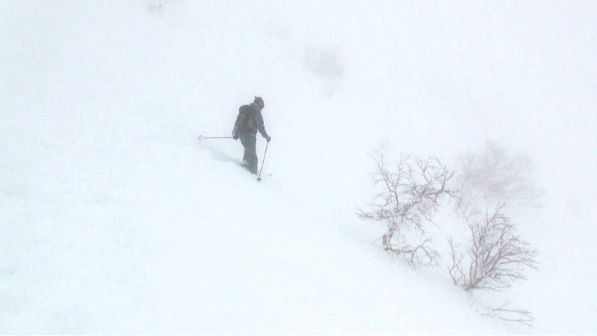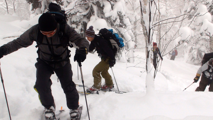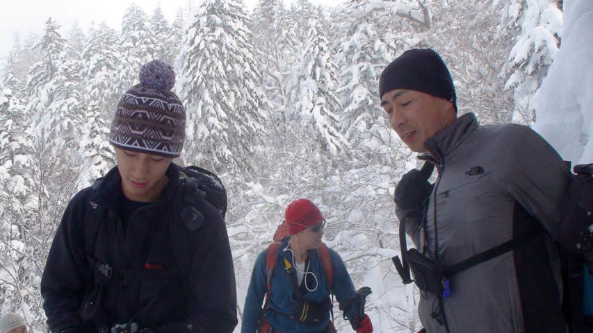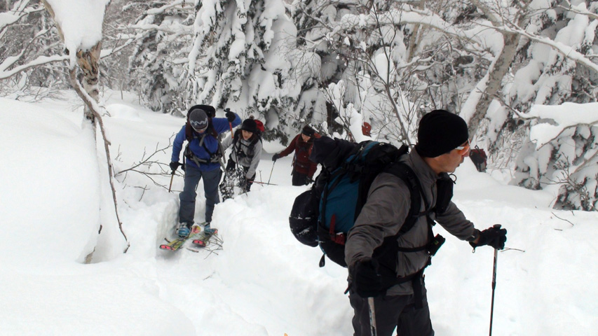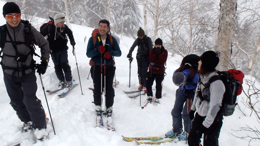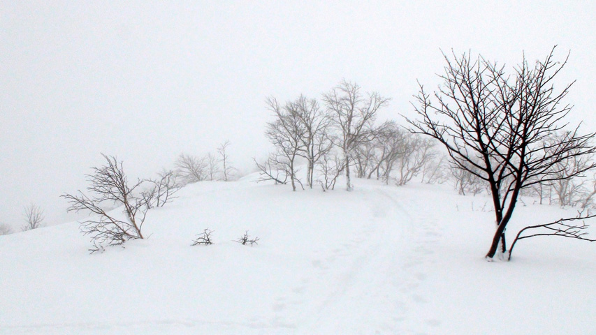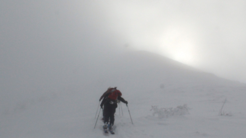 さらに森林限界より上はガスが濃くて雪面がよく見えなかったので、悪い雪との二重苦に苦しんだツアーとなった。