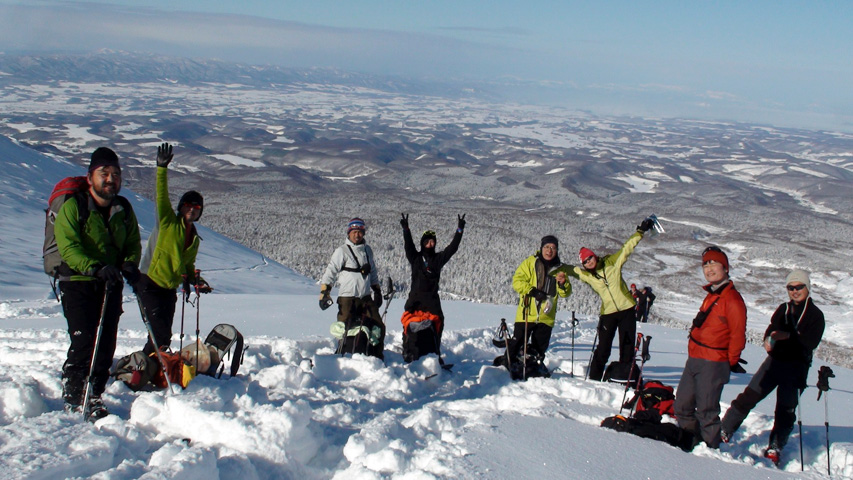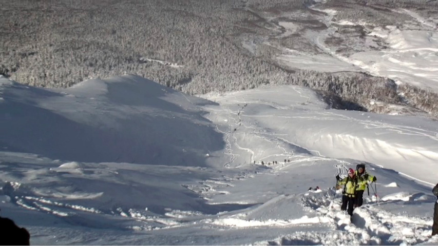 当初は、週末に開催される雪崩講習会のトレーニングフィールドの下見のためのツアーだったが、ここで第一目的を「三段山山頂を目指し、ツアーを楽しむこと」に変更。下見はツアーを楽しんだ後で・・