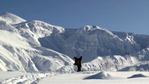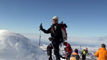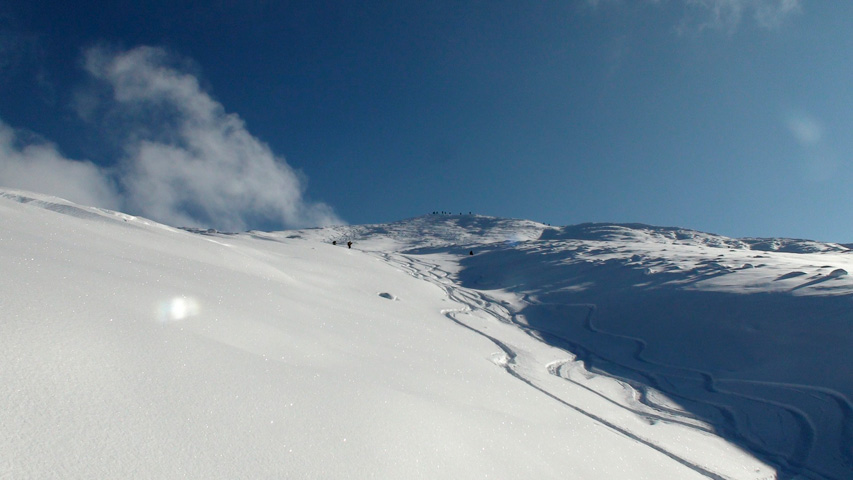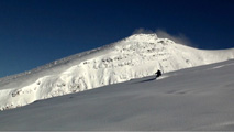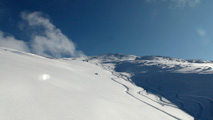 ノーマルルートはすでに沢山のシュプールが刻まれていたので、滑降ルートを北壁を偵察しつつ東谷と定めた。