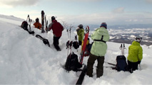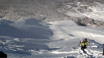 大西がスキーカットをして安定性を確認し、行けると判断。大所帯のパーティを2本のシュートに分散させ、一人づつボトムへ滑り込んでもらった。