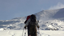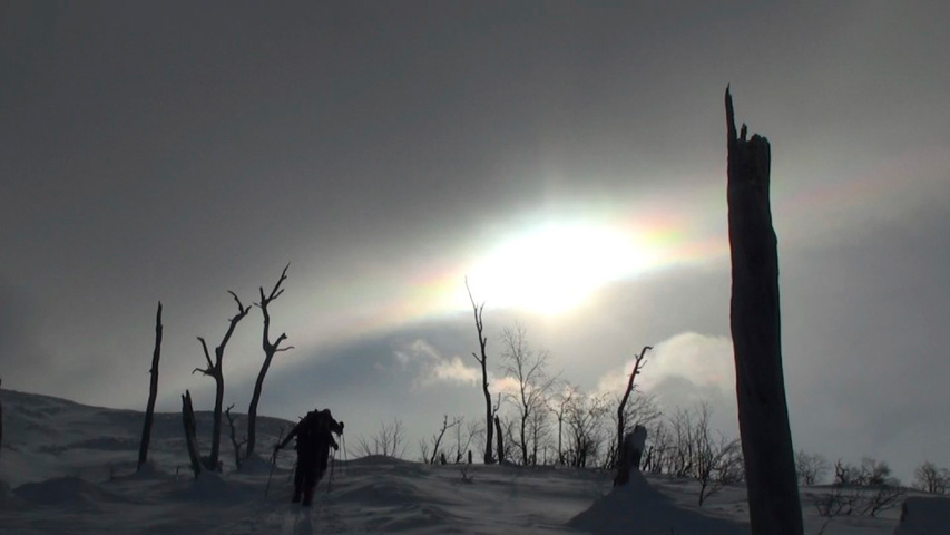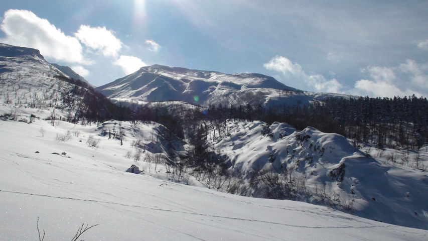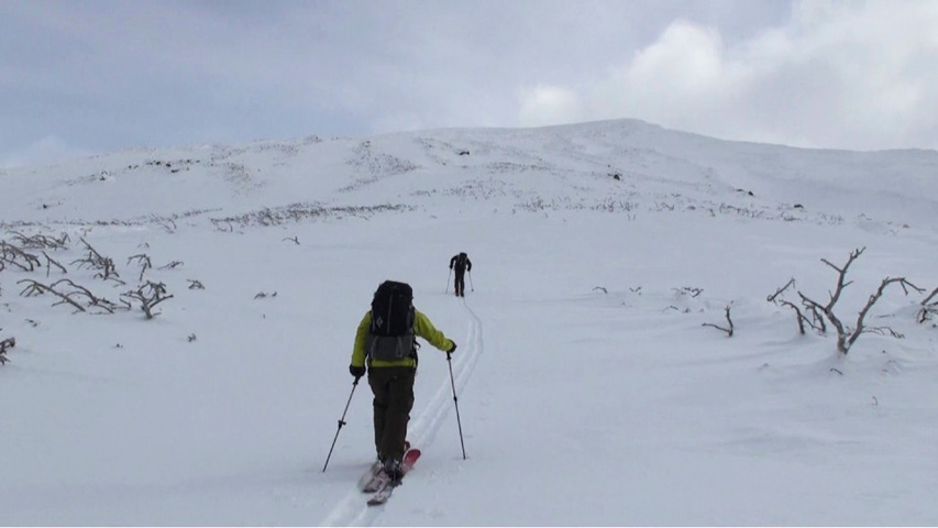 尾根上の雪は飛ばされていたが、谷沿いには良い雪が溜まっていそうだったので頑張って高度を上げた。しかし西側から雲が来ていたので1500m付近で谷に入って滑降。