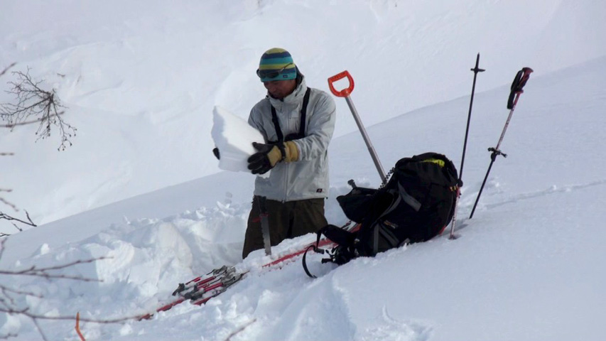カバワラ尾根での休憩中にぱっちまんが弱層テストをしたら、コシモザラメの弱層だらけ。私もシャベルコンプレッションテストをして、-20,-40cmにコシモザラメの弱層を確認した。