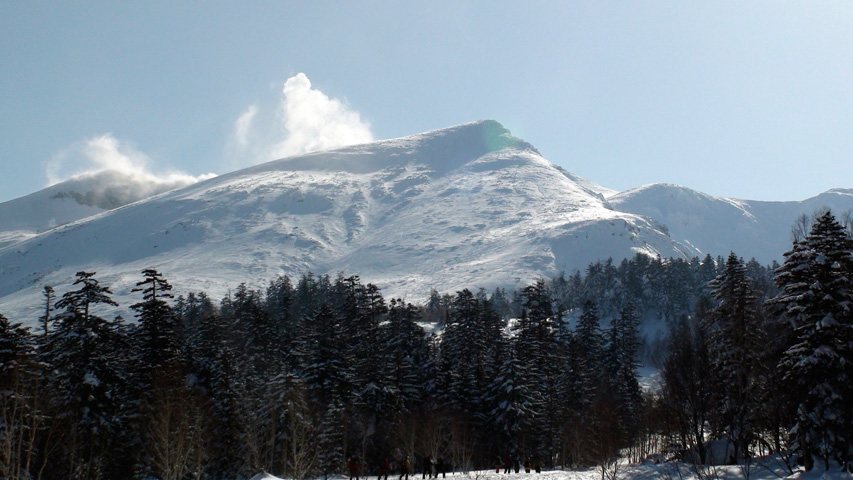 山は快晴。登山口は無風。ただし十勝岳の噴煙がかなりなびいていて、よく見ると稜線には雪煙が・・