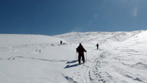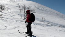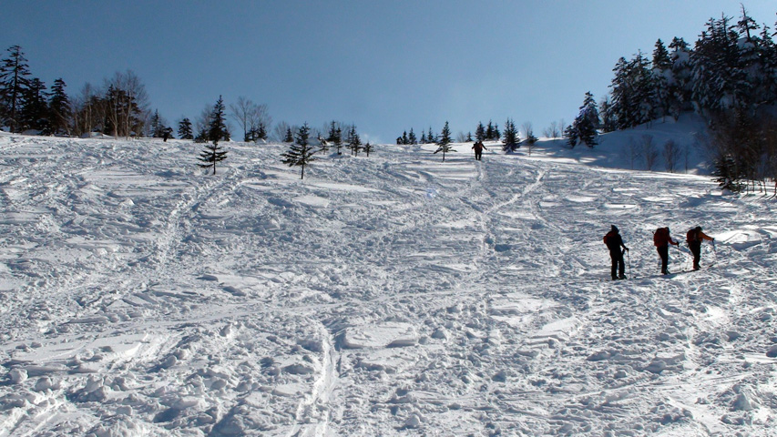 四段目くらいから浅い風成雪の下に堅いギャップを感じ始め、稜線上は完全なクラスト。