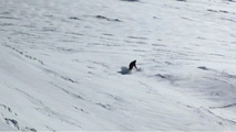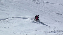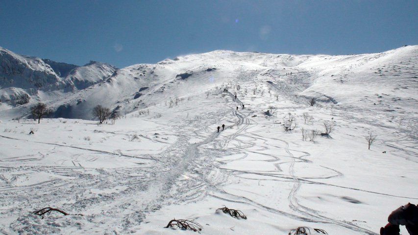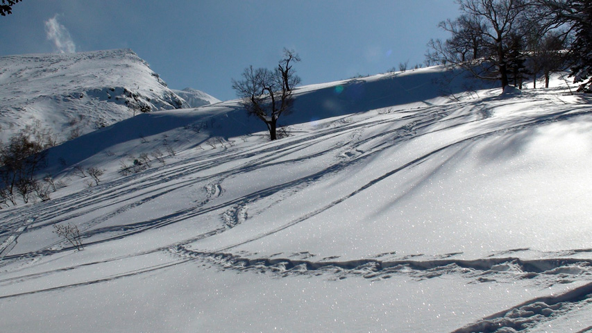 確かに見渡す限りズタズタだったが、東の谷と西の谷にはあまりシュプールが無いようだった。また、気温が低いので表層の雪質は良い。