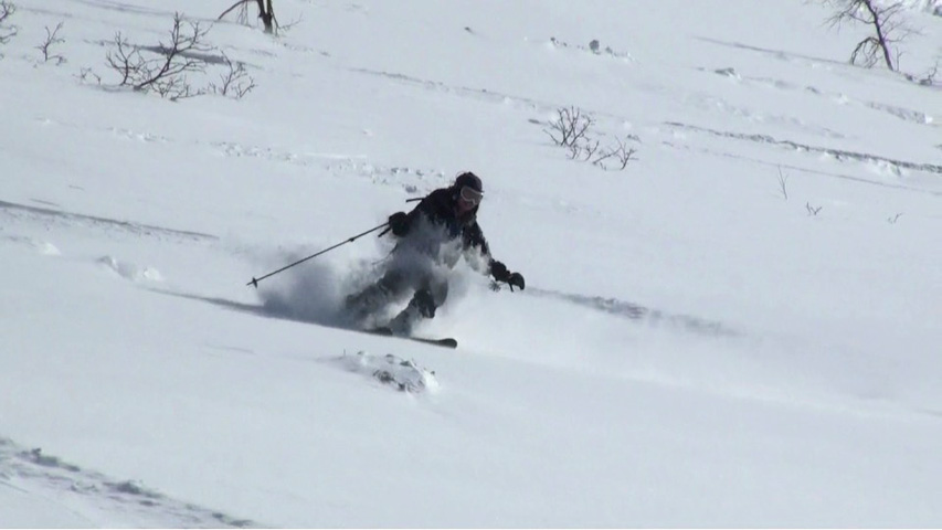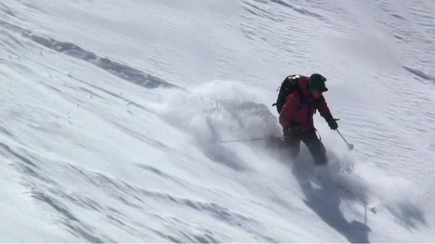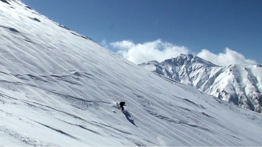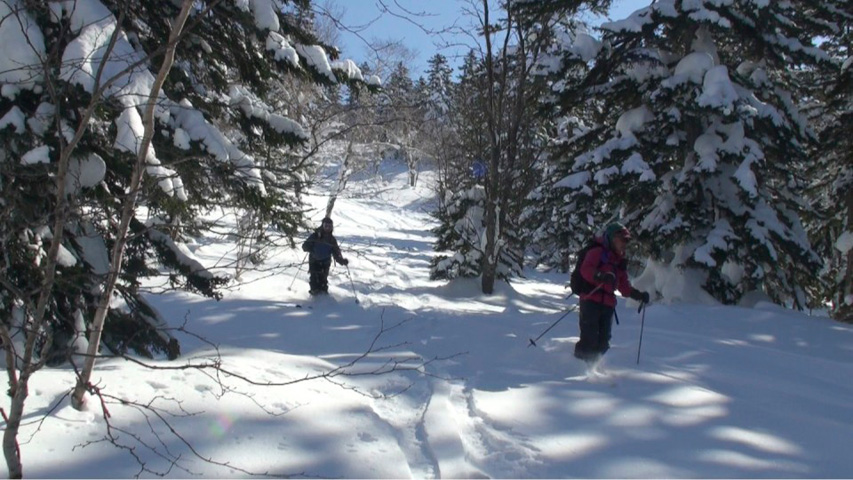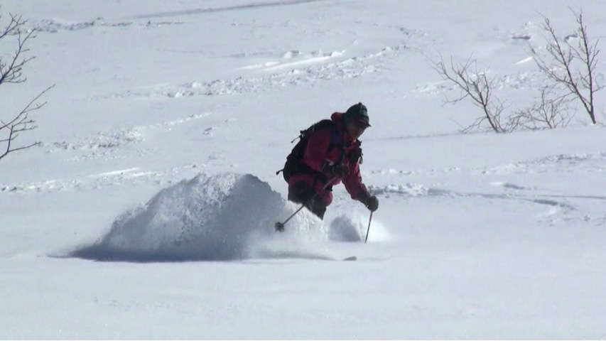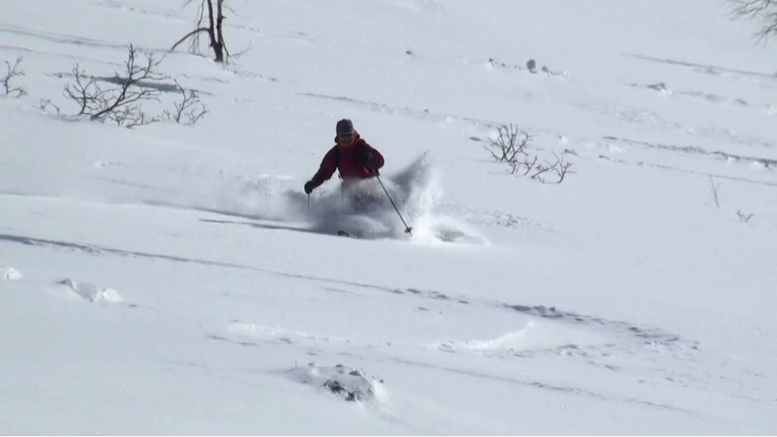 三段山山頂は長居ができるような状態ではなかったので、すぐに雪の吹きだまりが期待できそうな西の谷へ入ったが、フリコ沢のコンディションも良さそうだった。
