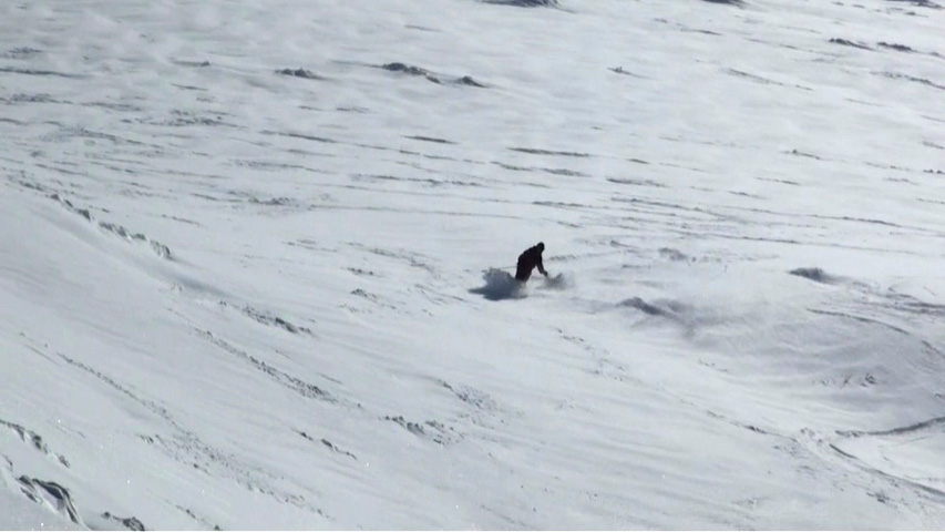 西の谷のシュプールは、強い風で運ばれる風成雪で覆われていた。