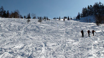 山野井さん、北村さんの華麗な皮靴滑り、Tさんのアグレッシブな山スキーの滑りを拝見しつつ、西の谷〜西の尾根の良い雪を繋いだ。最後は三段山火口の尾根を登り返し、樹林帯を滑って終了。