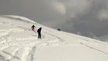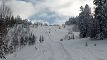 えぇい!登り返しだ!というわけで、再びシールを装着して西の尾根を登り返し。西の尾根に残っていたノートラック斜面を滑った。