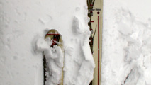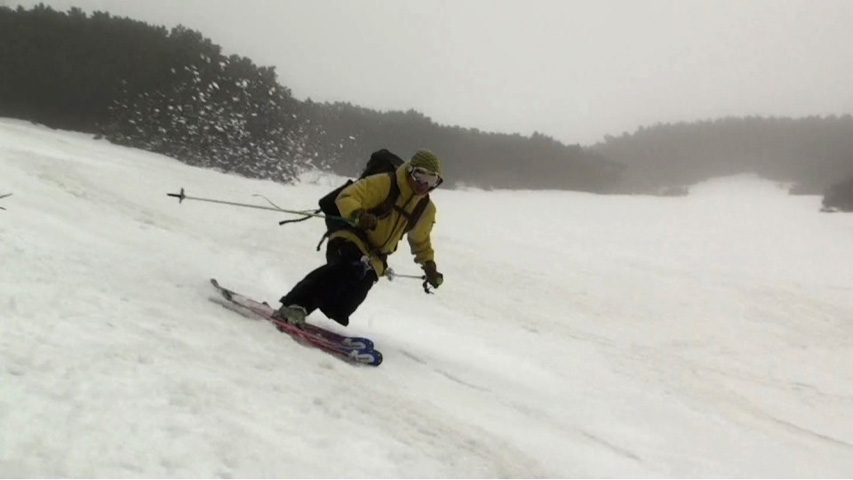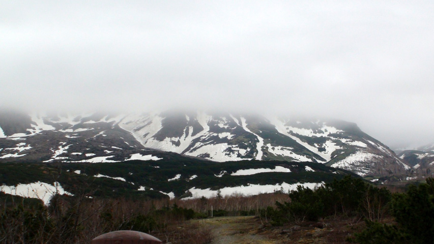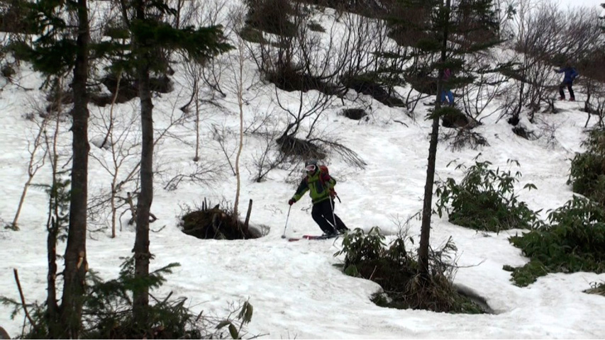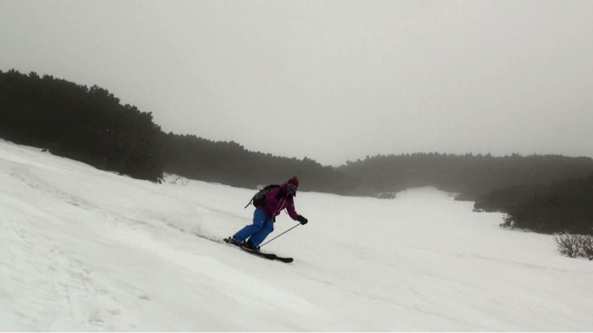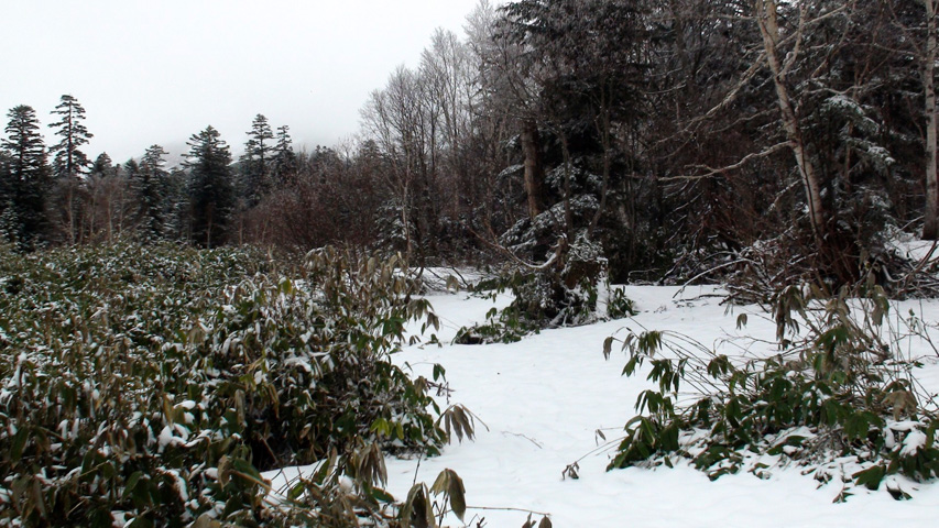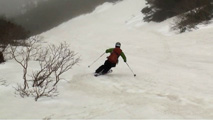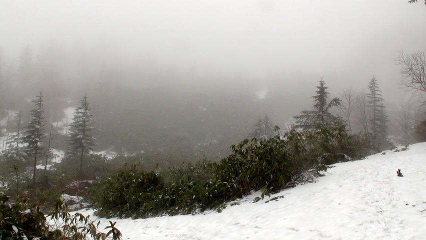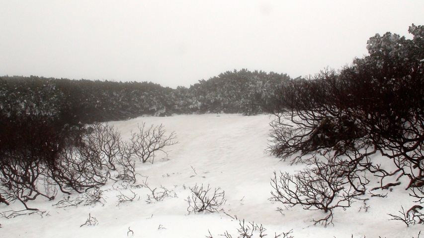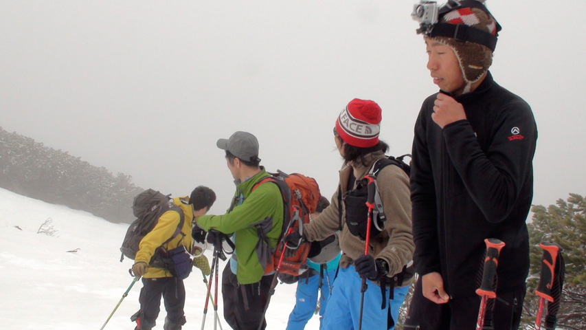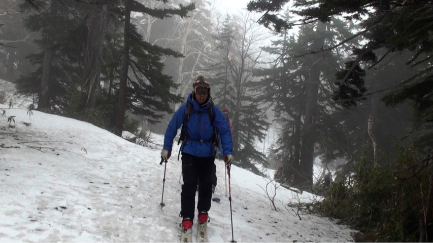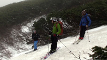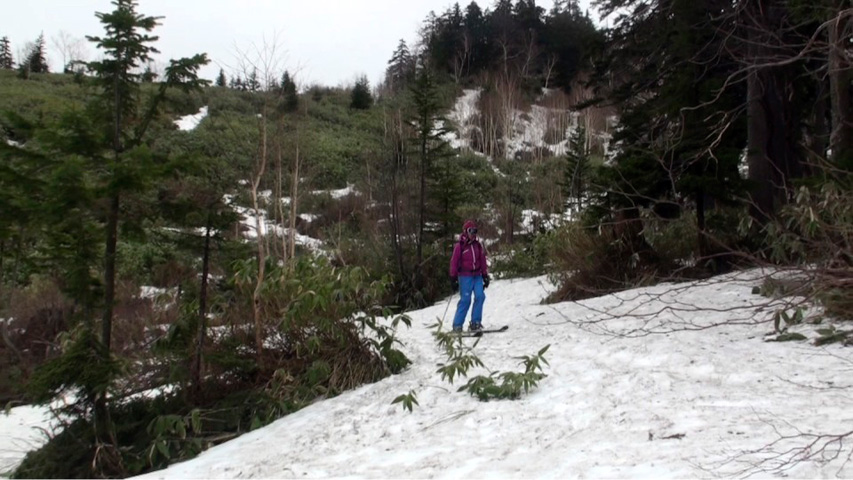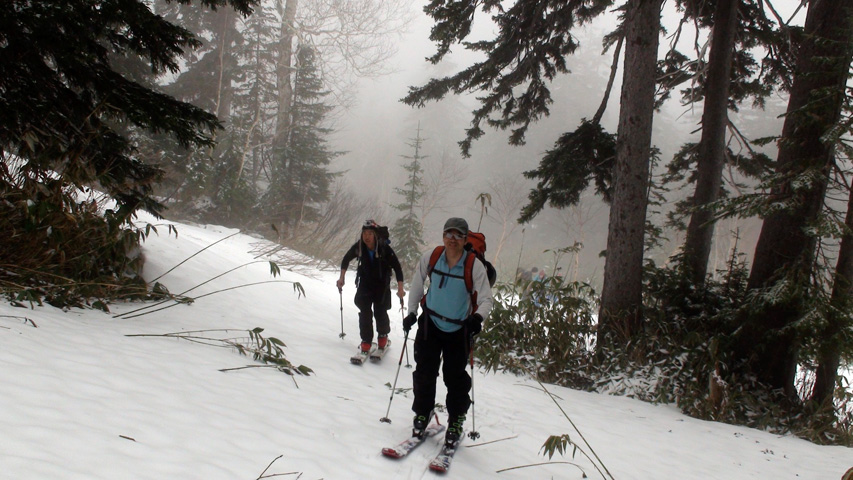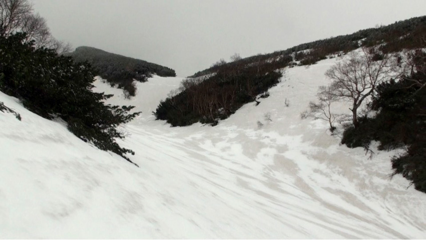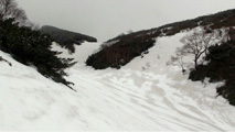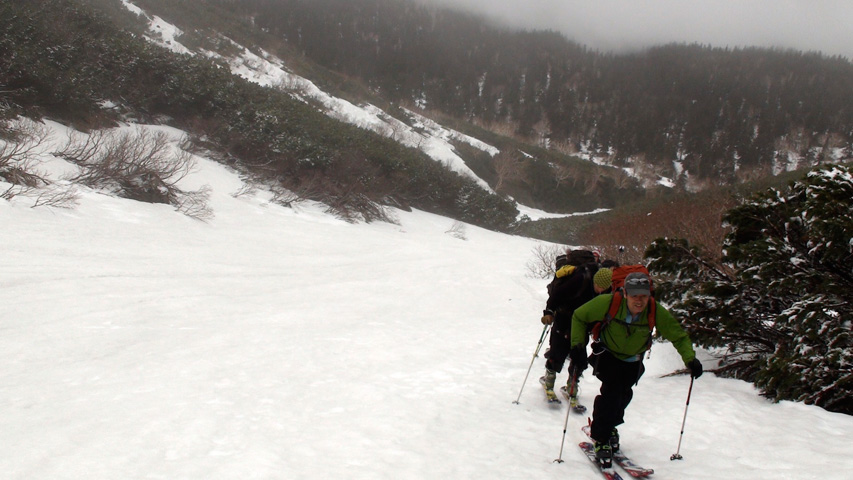 西の谷を詰めていったが、稜線手前でハイ松に阻まれた。天気が良ければ稜線から安政火口を見下ろしたかったが、ガスで視界が悪かったので、無理せずにここから滑降する。