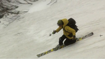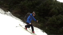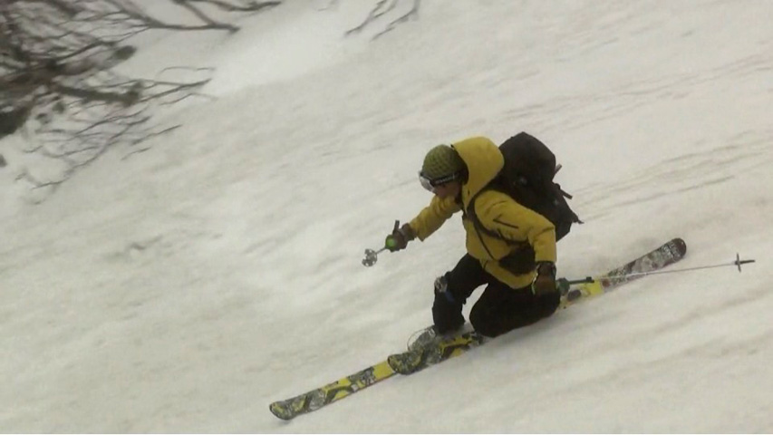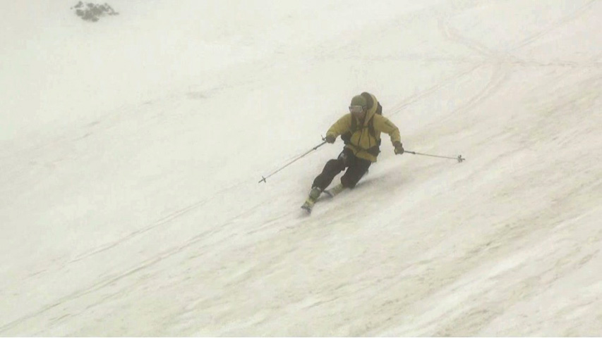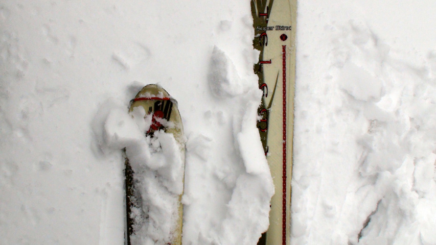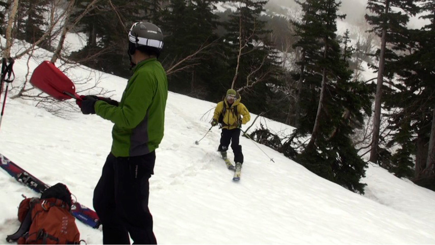 後続パーティが上がってくる中、お互いを撮影しながら高度を下げていく。しかし、西の谷核心部から下からは雪質が変わり、新雪部分がストップ雪になってしまった。残念。