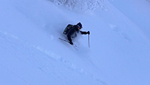 ※滑降地点でコンプレッションテストをしたところ、CTH22(SP)down70 (腕全体の力で叩いて2回目に、深さ70センチで破壊。破壊の特徴は瞬間的でクリーン) 融解凍結クラストの上に霜ざらめの弱層が認められたので、念のためにスキーカットを実施した。