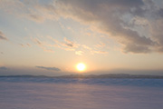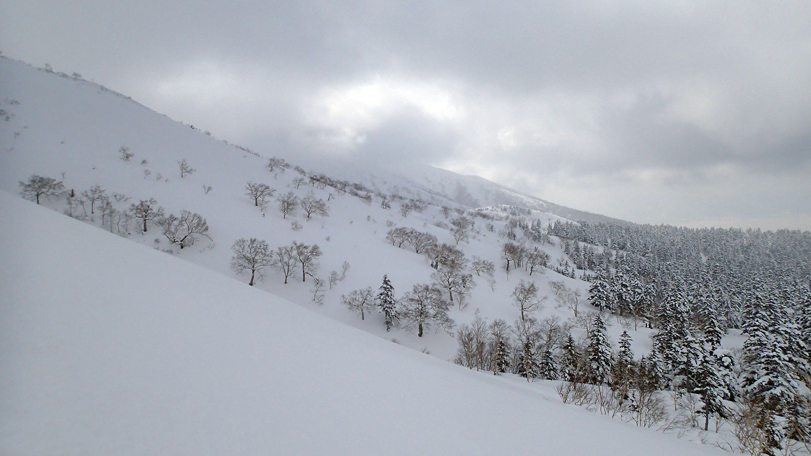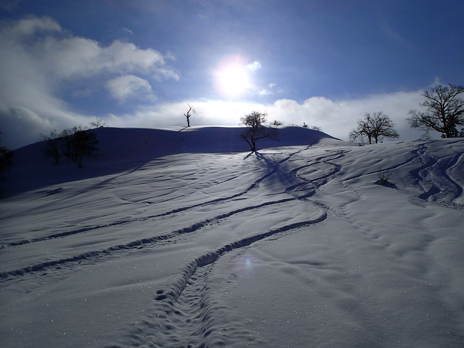 かなり下降気味に西の谷へトラバースしていき、やっと先行者のシュプールを見つけることができた。シュプールやトラックさえあれば、それで斜度やスピードを判断して滑る事ができる。シュプールが無ければ尺取り虫式滑降を強いられていただろう。