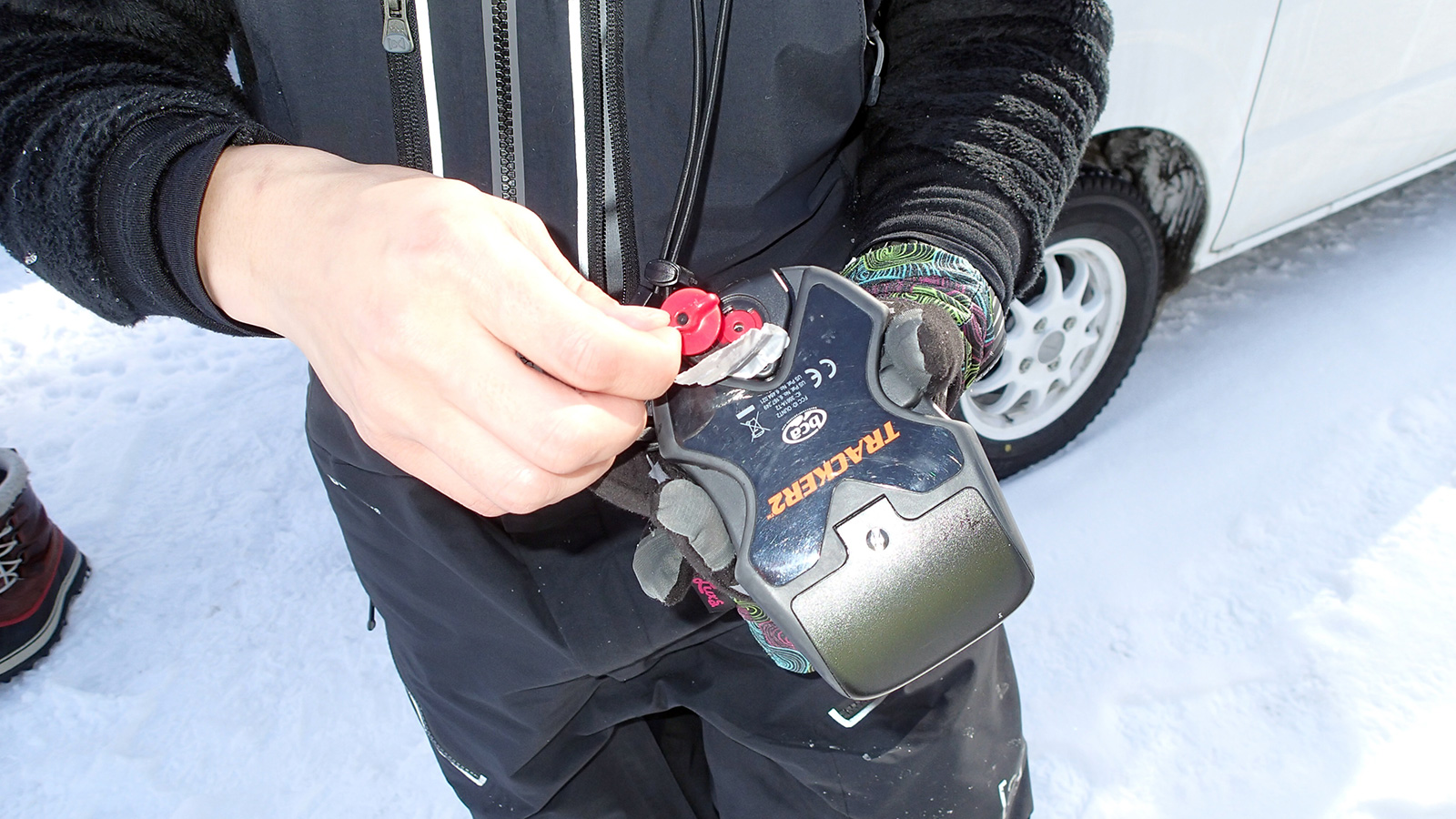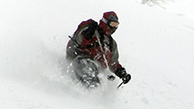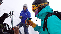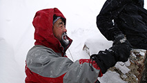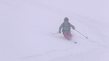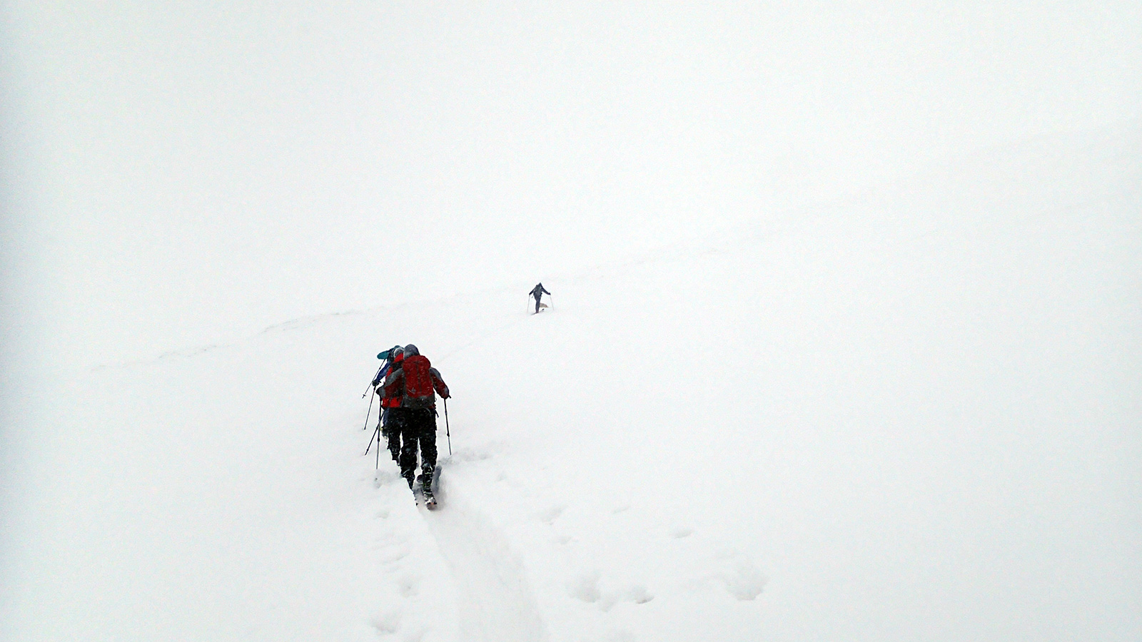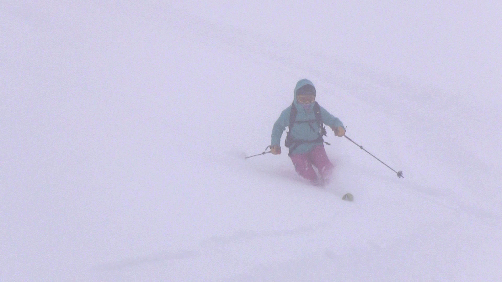 多少待っても天候は回復しそうもないので渋々滑降してみたが、ホワイトアウトで斜度どころか自分が滑っているのか止まっているのかも分からないほど。現在位置や滑降ルートはGPS頼み。これはやばいなーと思っていたら、後方から「きゃー!」という悲鳴が!田中ママが雪庇から3m程転落してしまったのだ。普段は雪庇なんか無い筈の場所なので、よほど強風が吹いたのだろう。転落した先が柔らかい雪だったので田中ママは無事だった。