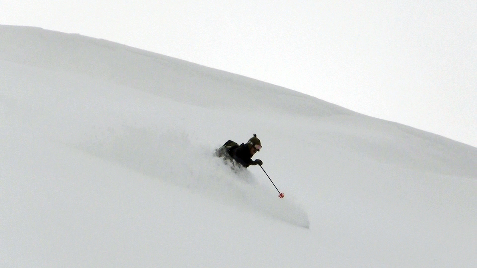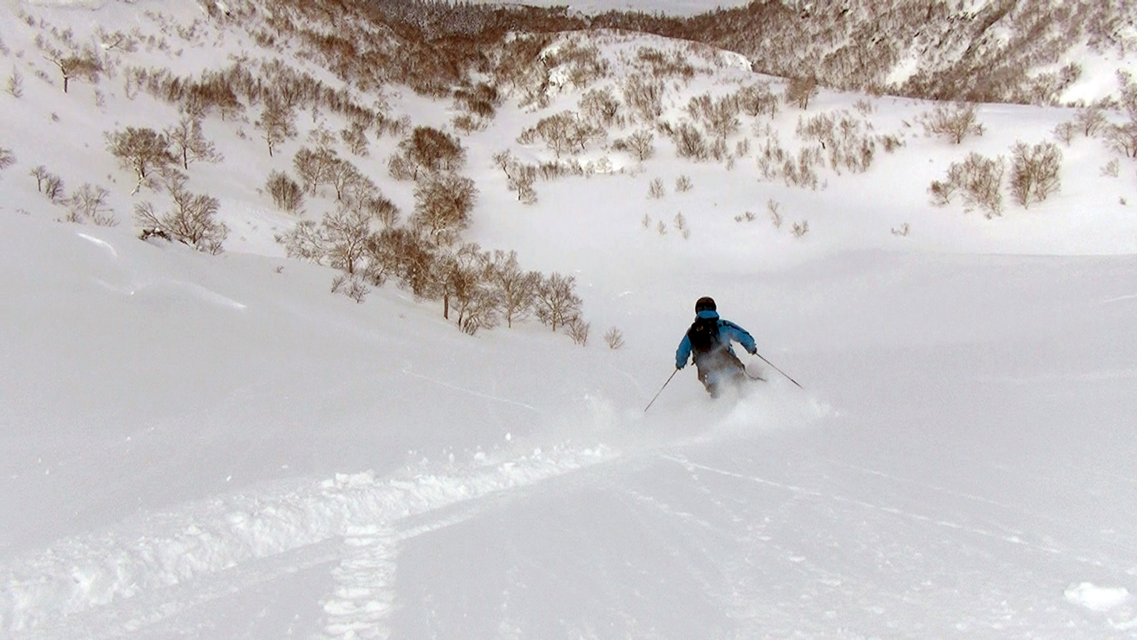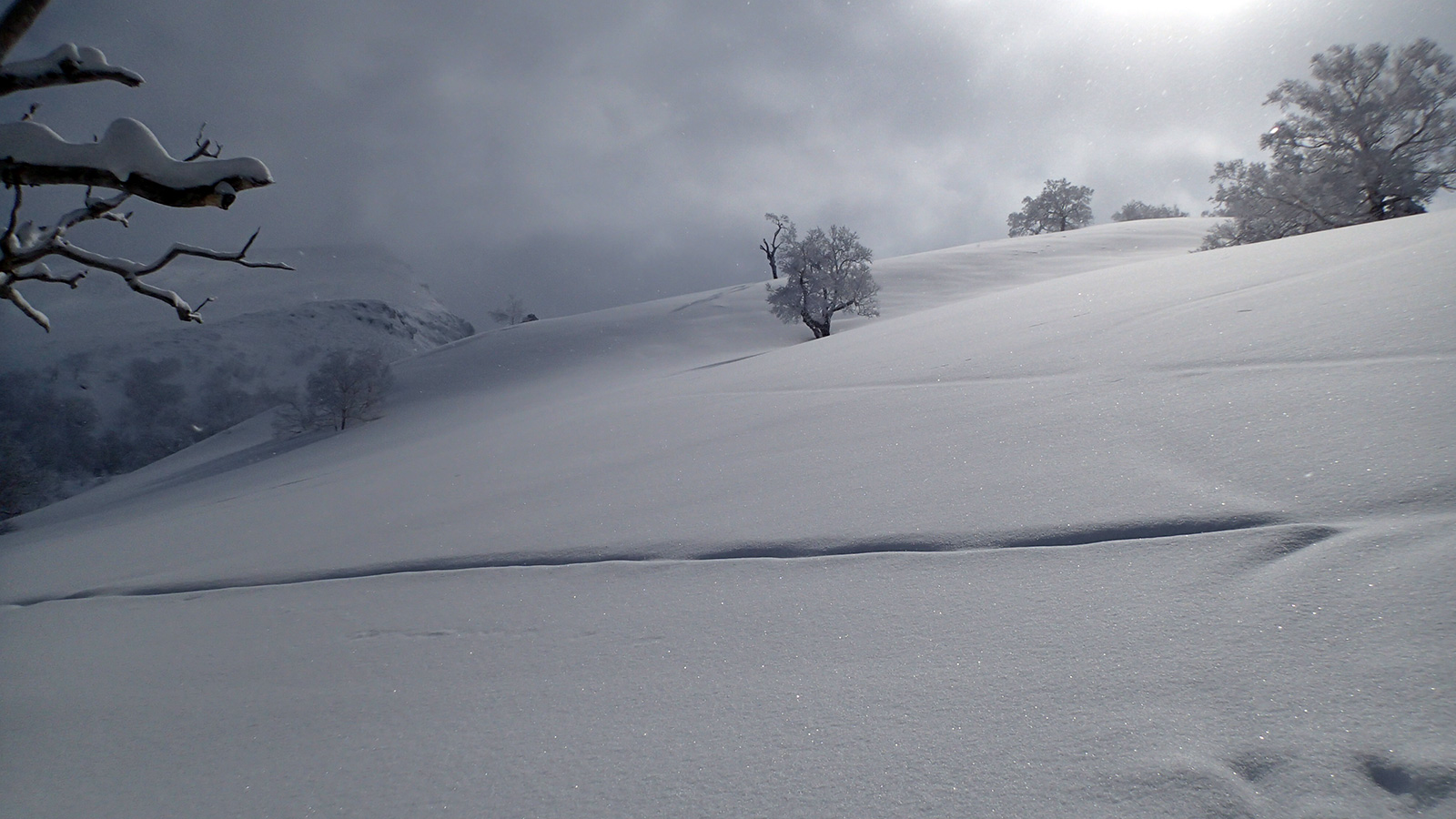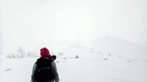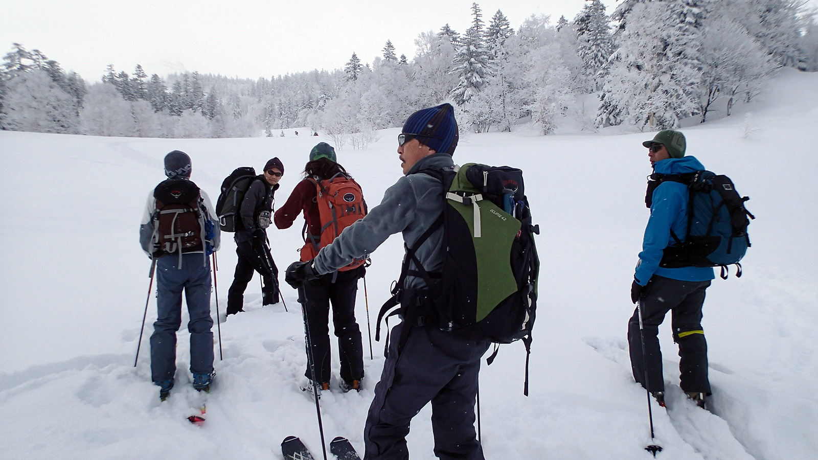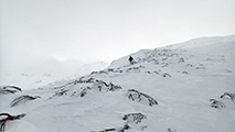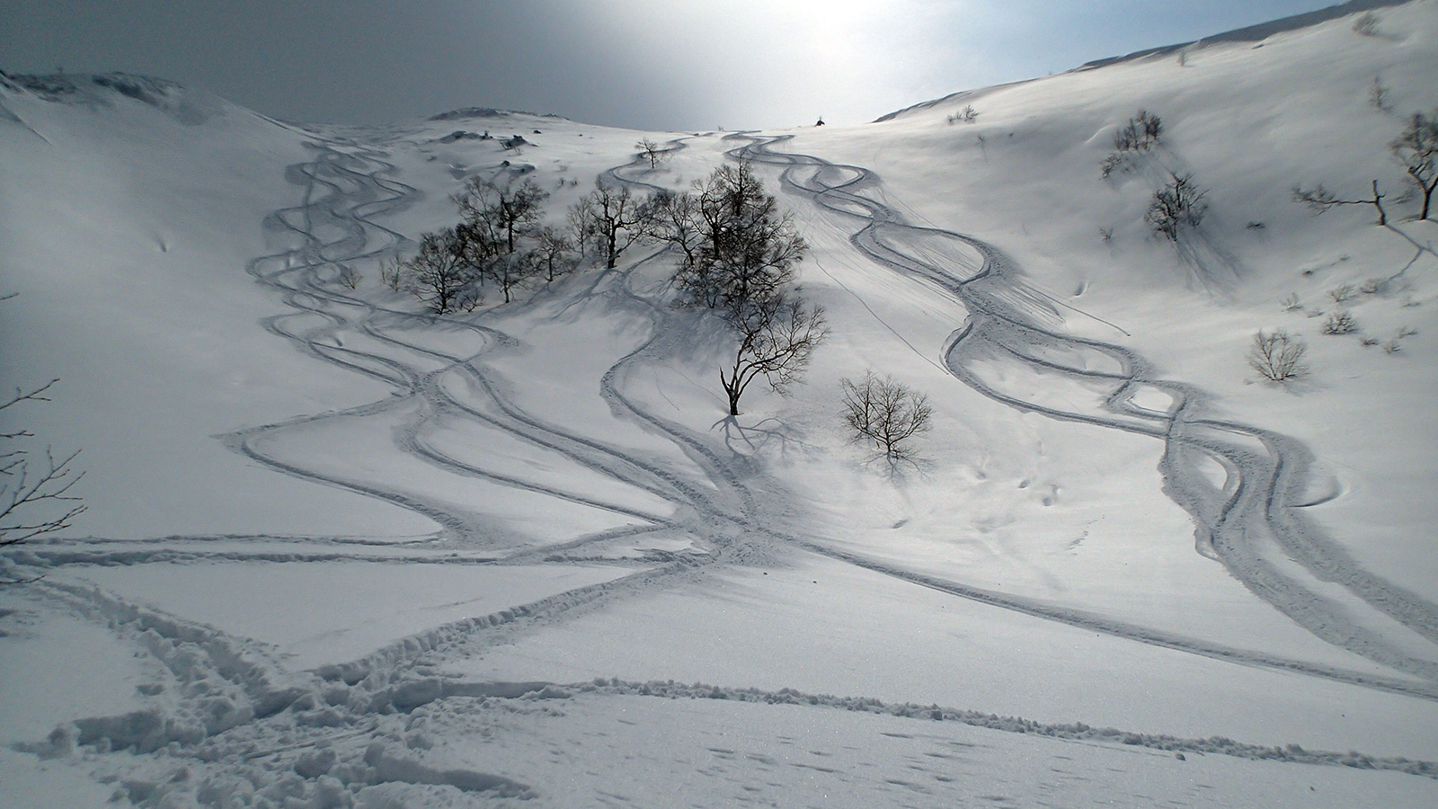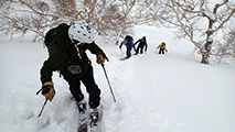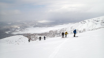 ツアーは、出発時は快晴。気温も-5度程度とまずまずのコンディションだと思ったが、高度を上げるにしたがい風が強くなり、標高1400m付近から上部ではシュカブラが発達していた。上部の視界も悪そうだったので、早々に山頂からの上ホロ撮影を諦めて東の谷へ滑り込むこととした。