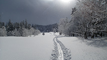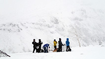 今回のツアーの目的の一つは、13日に発生した上ホロ雪崩事故の現場を三段山山頂から撮影すること。それはいいのだが、大西は、ザックを家に忘れて来てしまった。今までいろいろ忘れ物をしてきたが、ザック丸ごと忘れたのは初めてで、自分でもビックリした。急遽スーさんからザックとシャベルを借りたが、その他の非常装備は仲間が頼り。あとは白銀荘でパンと飲料水だけを買ってザックに突っ込み出発。