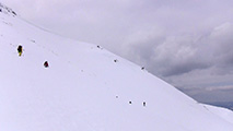 雪が良さそうだったので、山頂からフリコ沢へ降りたが、意外と難しい雪で、皆板が刺さってコロコロと転がっていた。コンプレッションテストの結果は、CTM15(BRK)Down30cm。