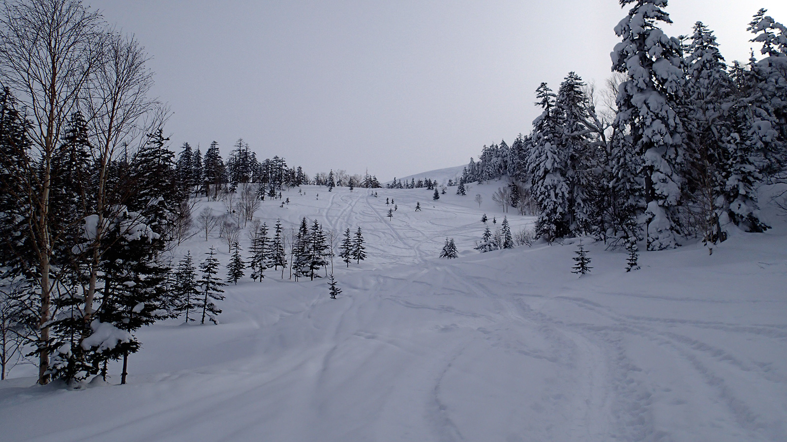 仕方なく西の尾根にほんの僅かに残された雪まで戻って、かろうじて一本滑り、樹林帯へ逃げ込んだ。