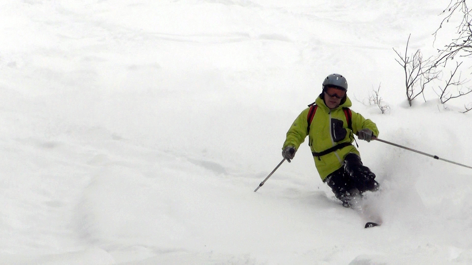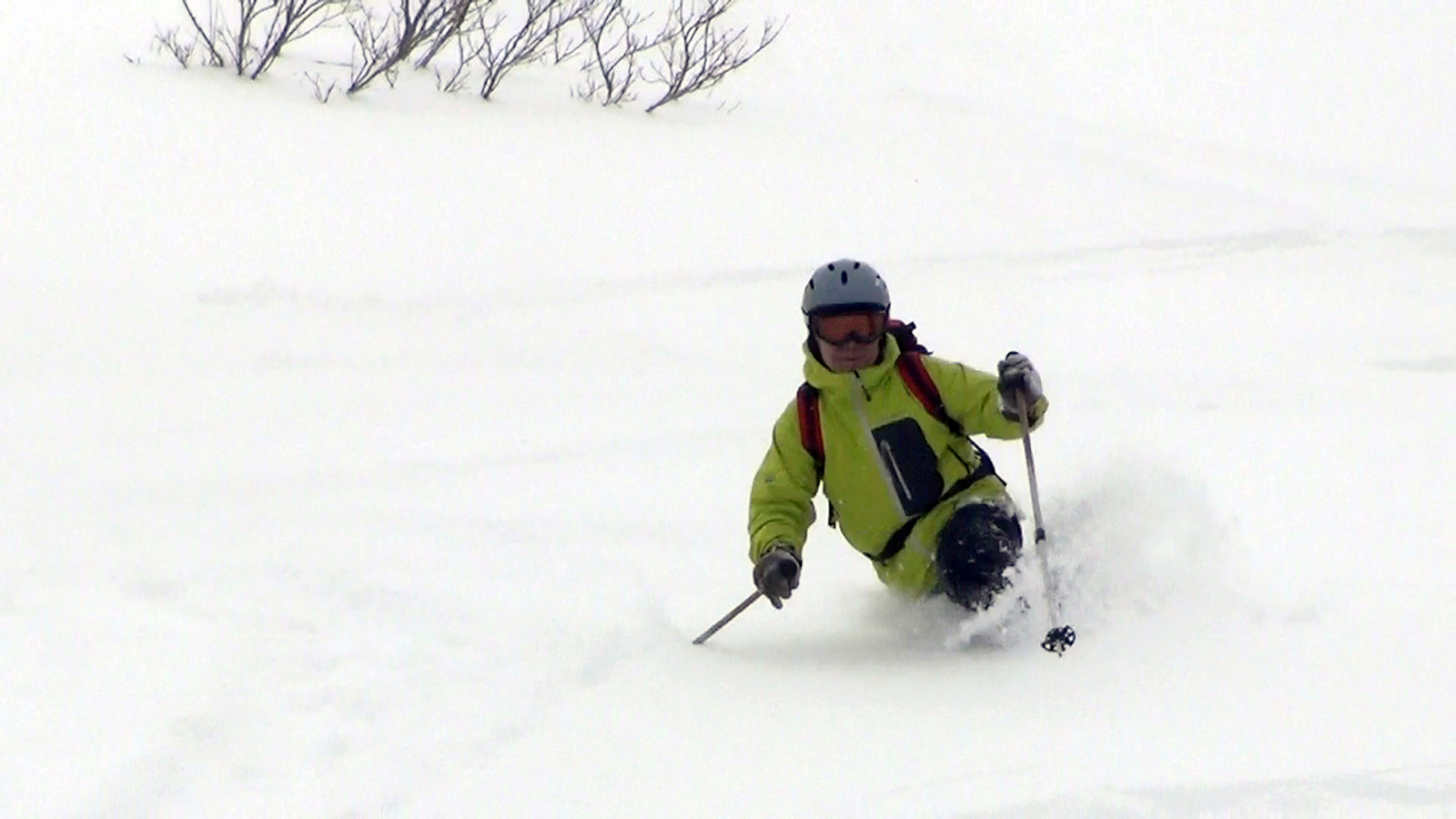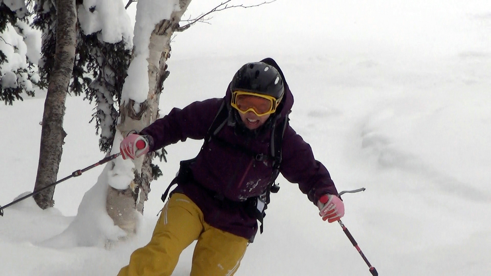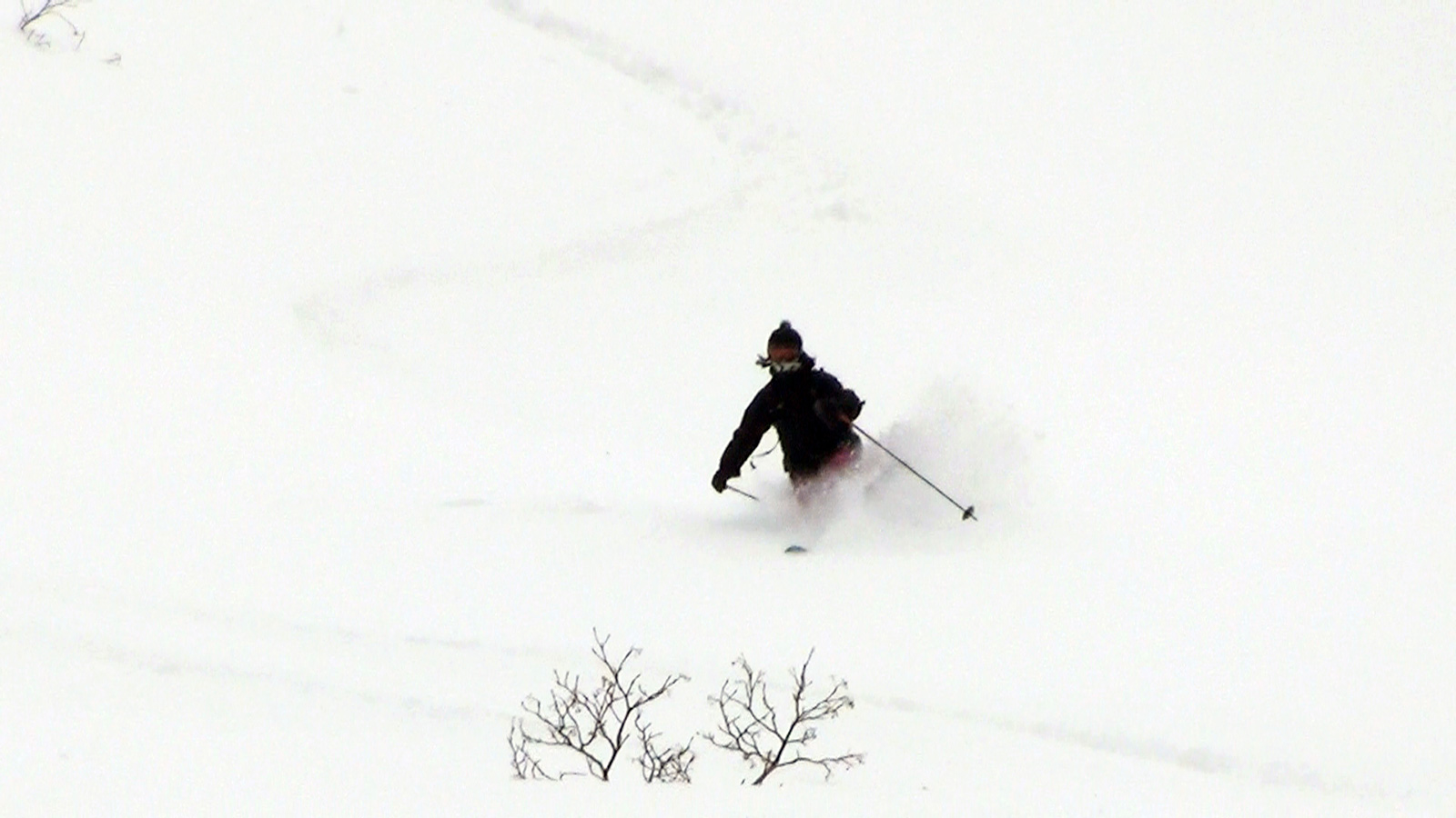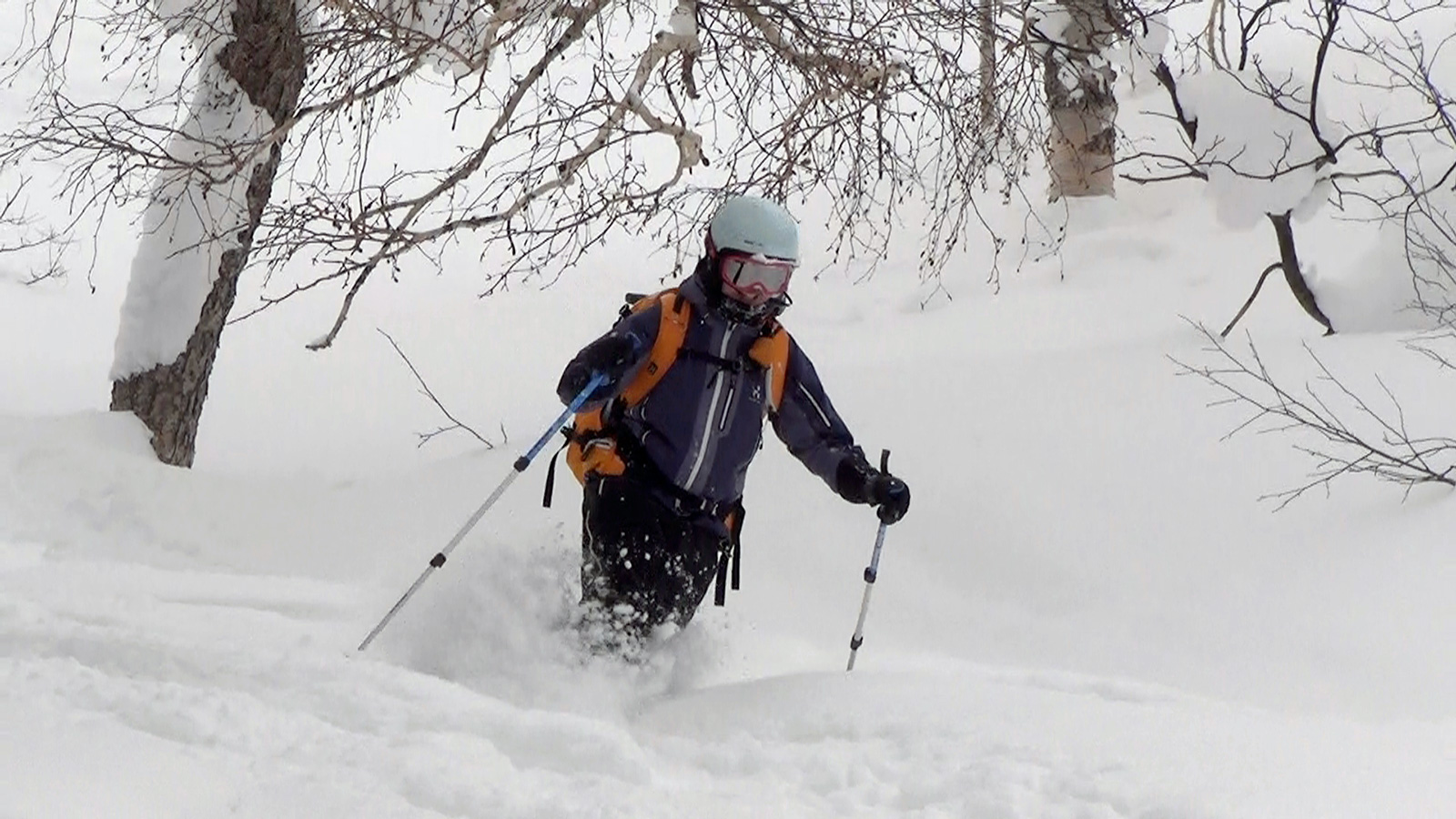 雪質:アルパインは重めのパウダー、一部ウィンドクラスト。樹林帯は全面重めのパウダー