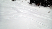 樹林帯の雪の良さに気を良くして登り返し。2段目の強風帯ギリギリからボウル斜面に入ろうとしたら雪崩れていた。