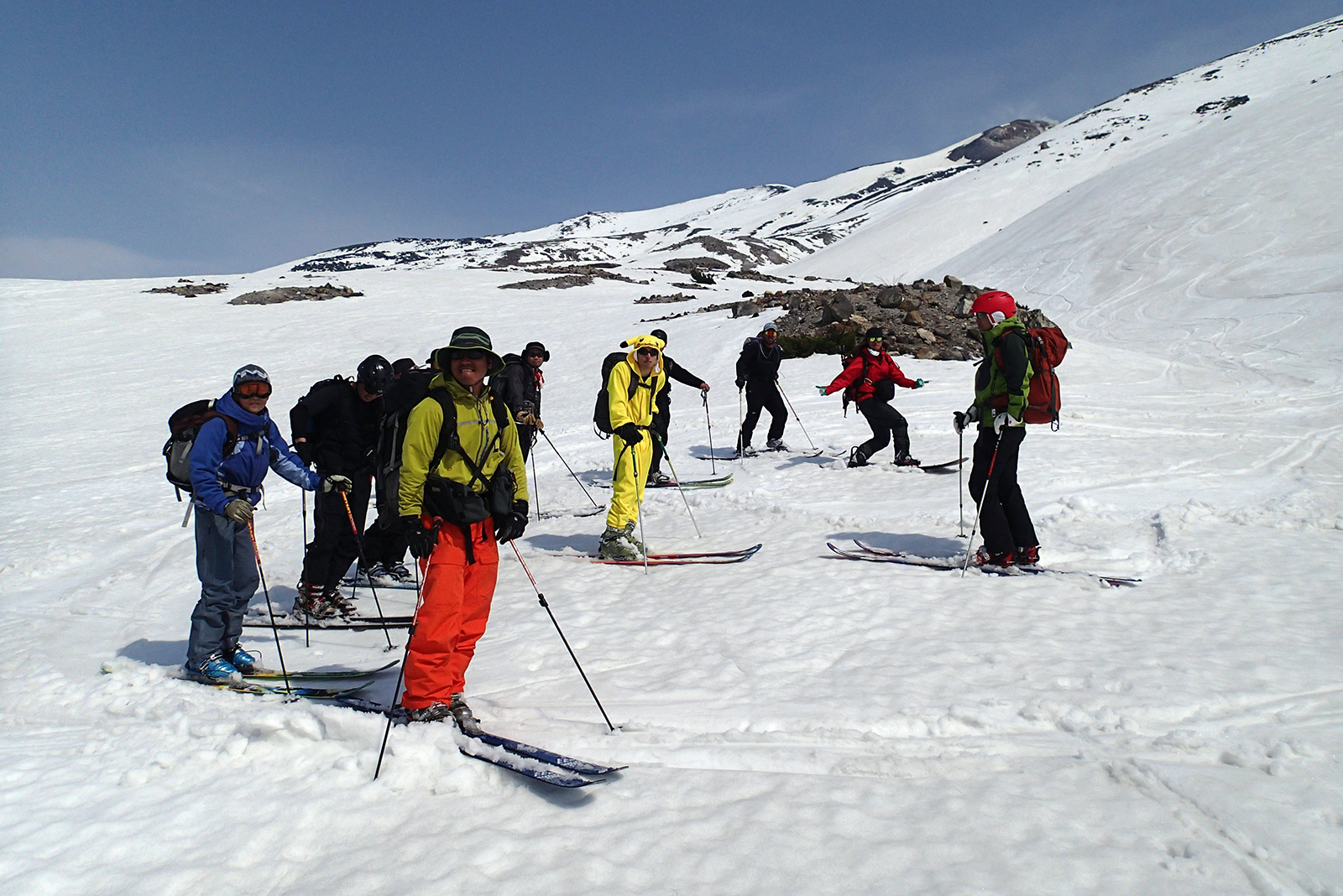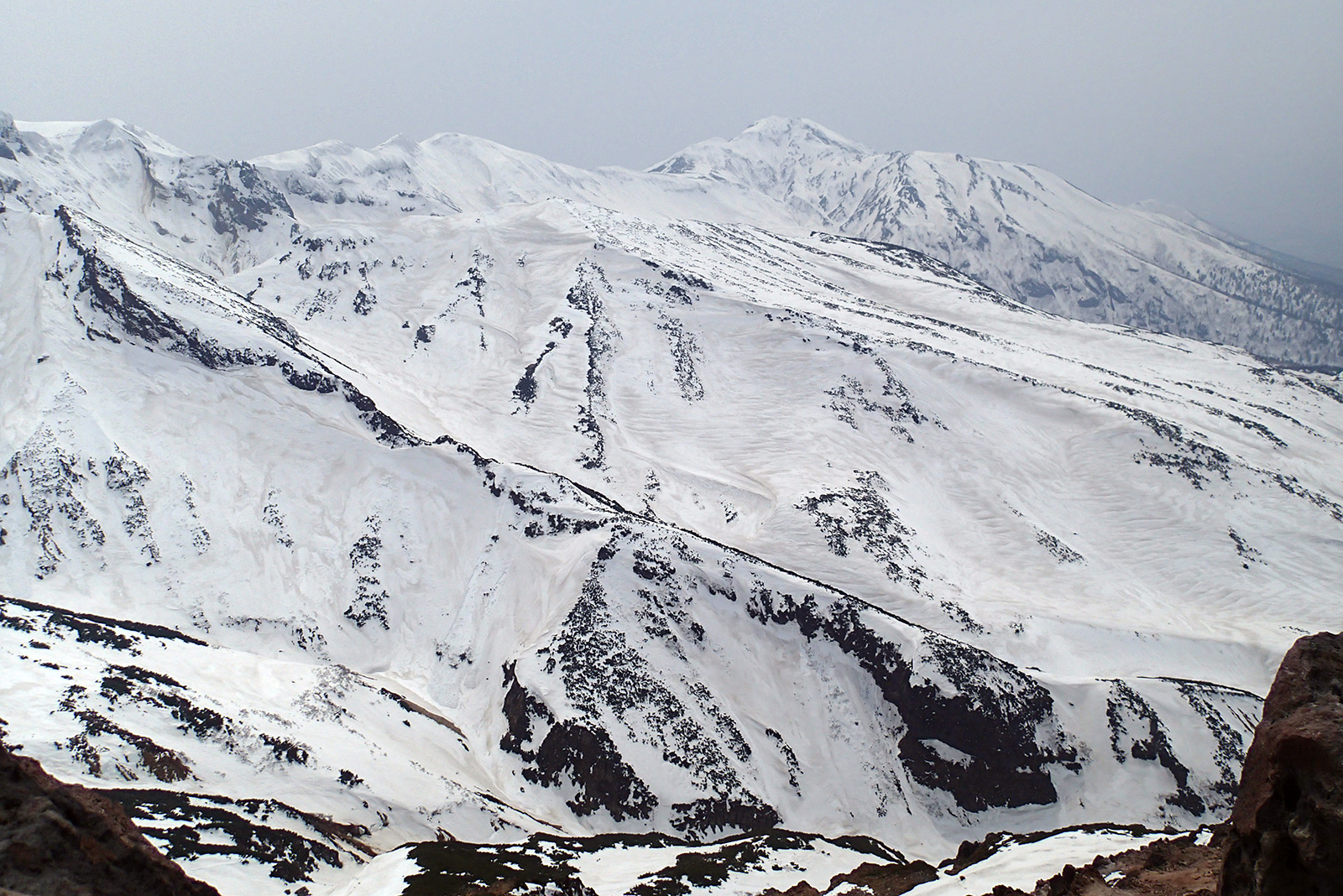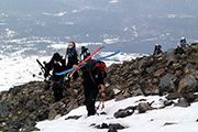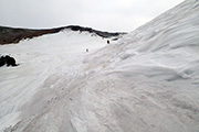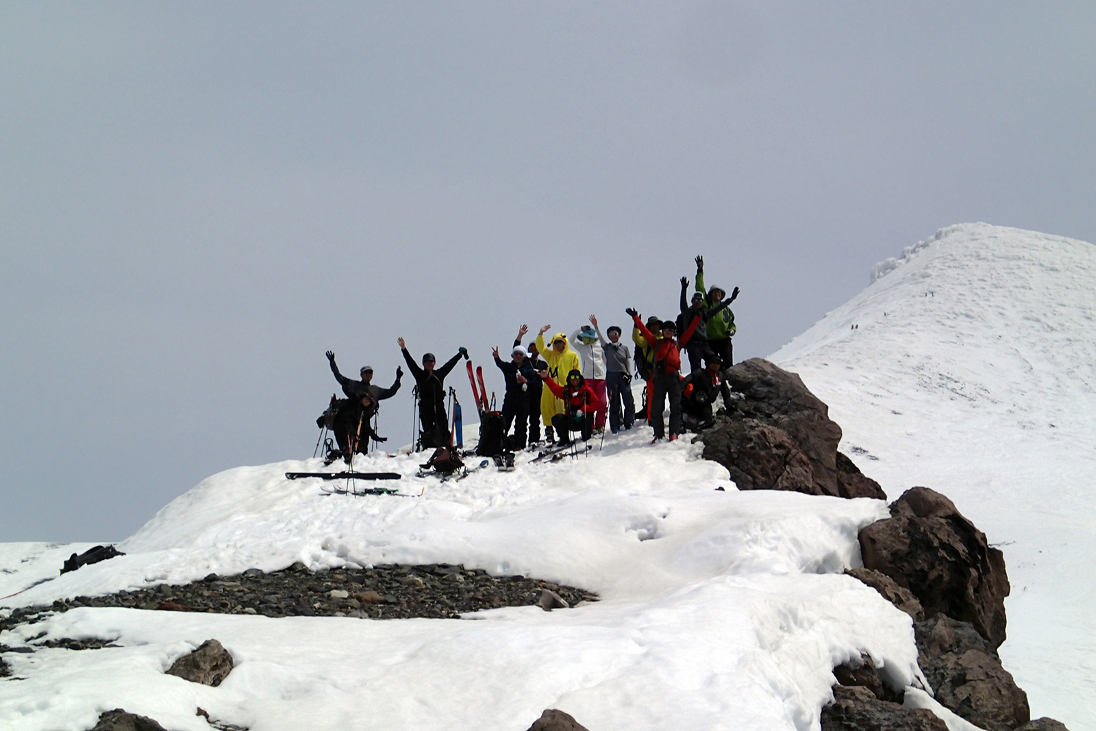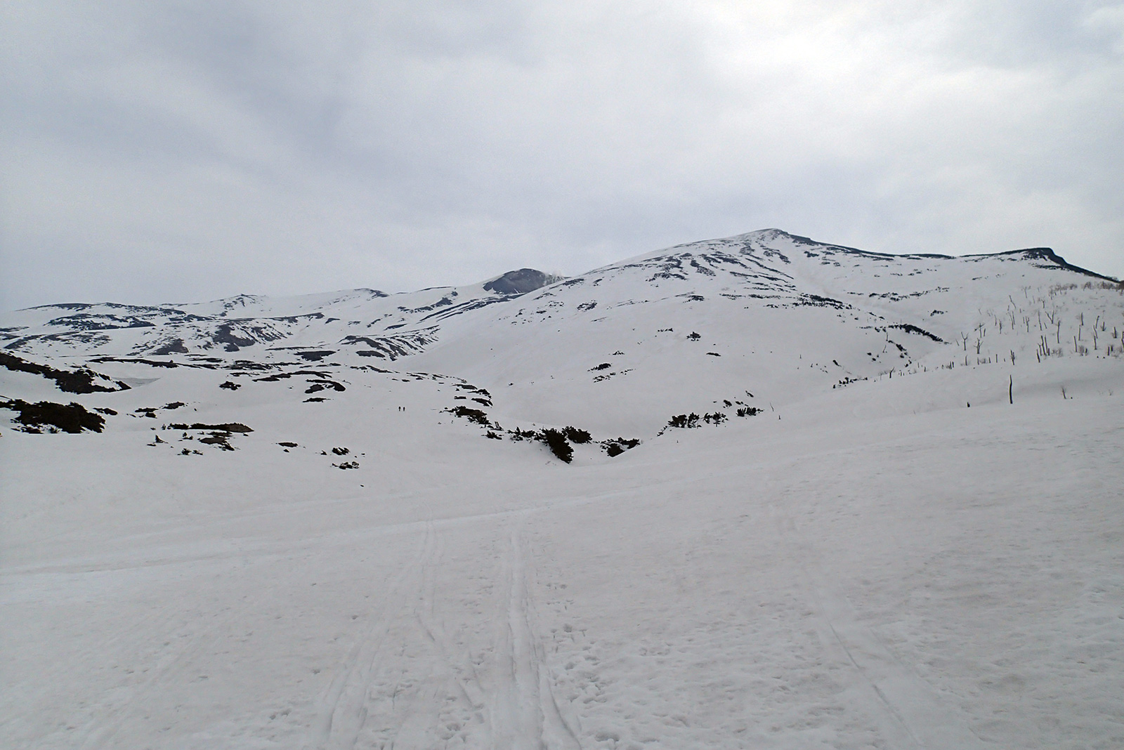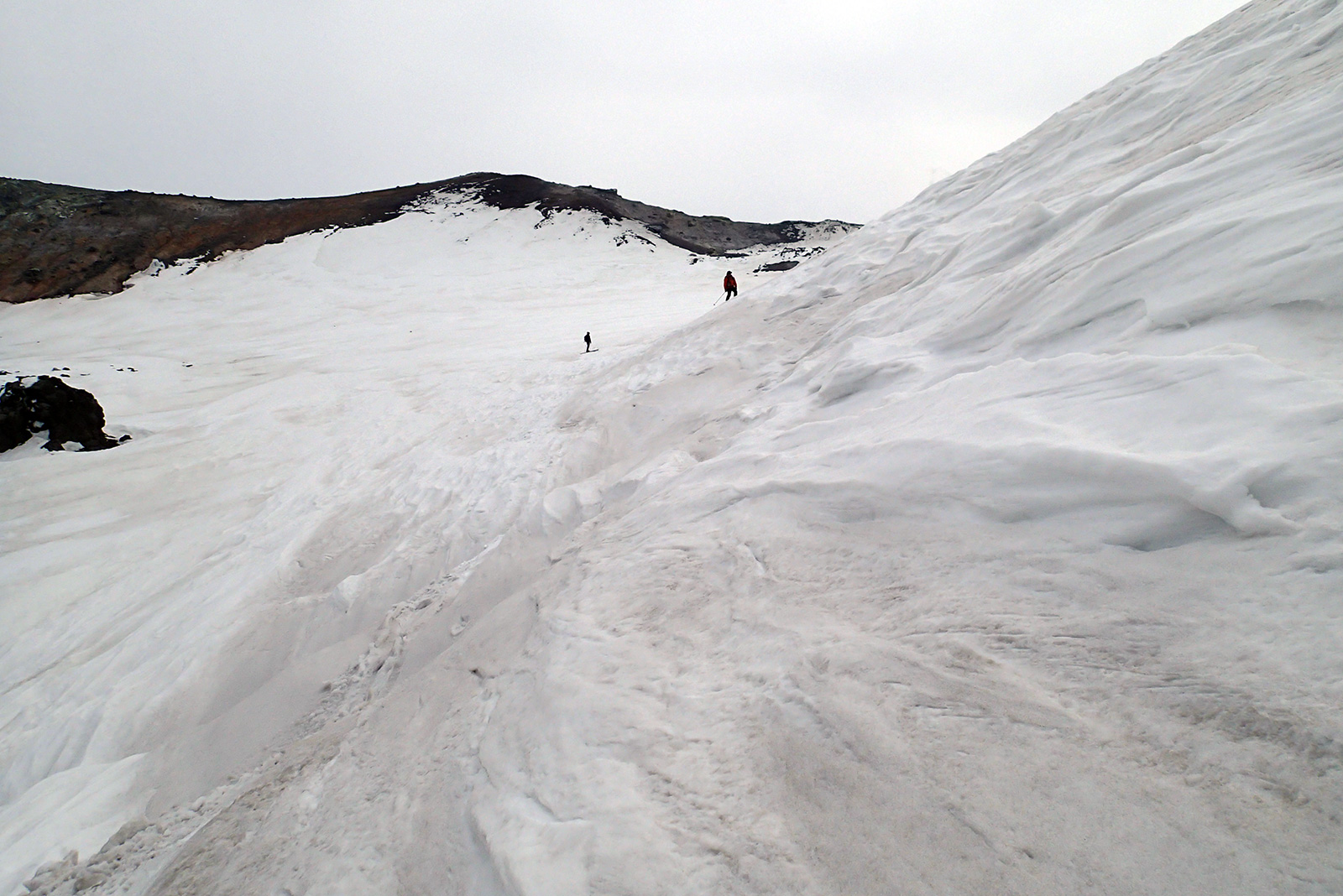 順調に十勝岳へ進んだが、噴煙が流れてきた。グラウンドを通過するのは危険と判断し、風上側の前十勝ピークに目的地を変更した。
