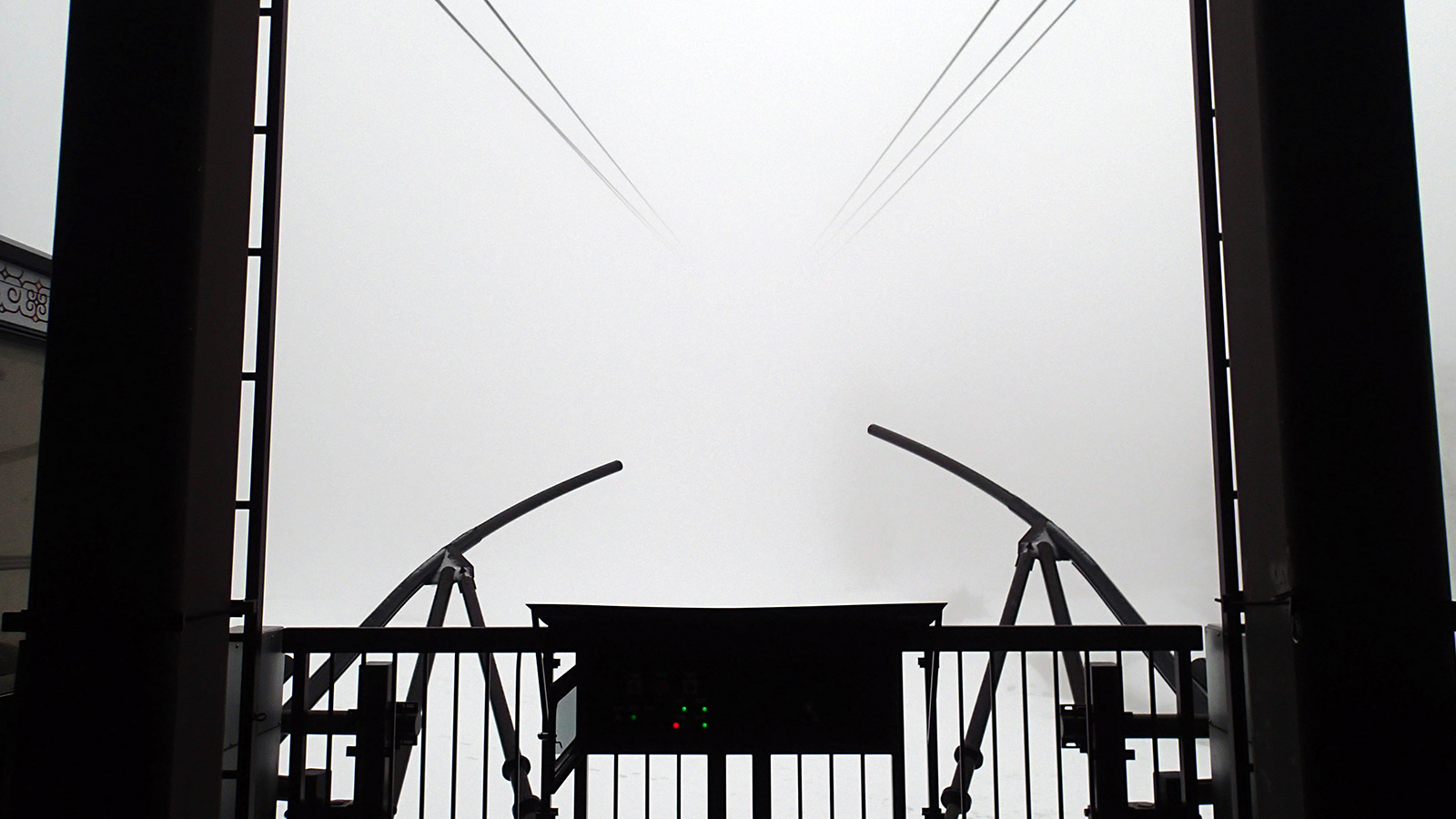 ロープウェイ乗り場 ホワイトアウトに消えるロープ