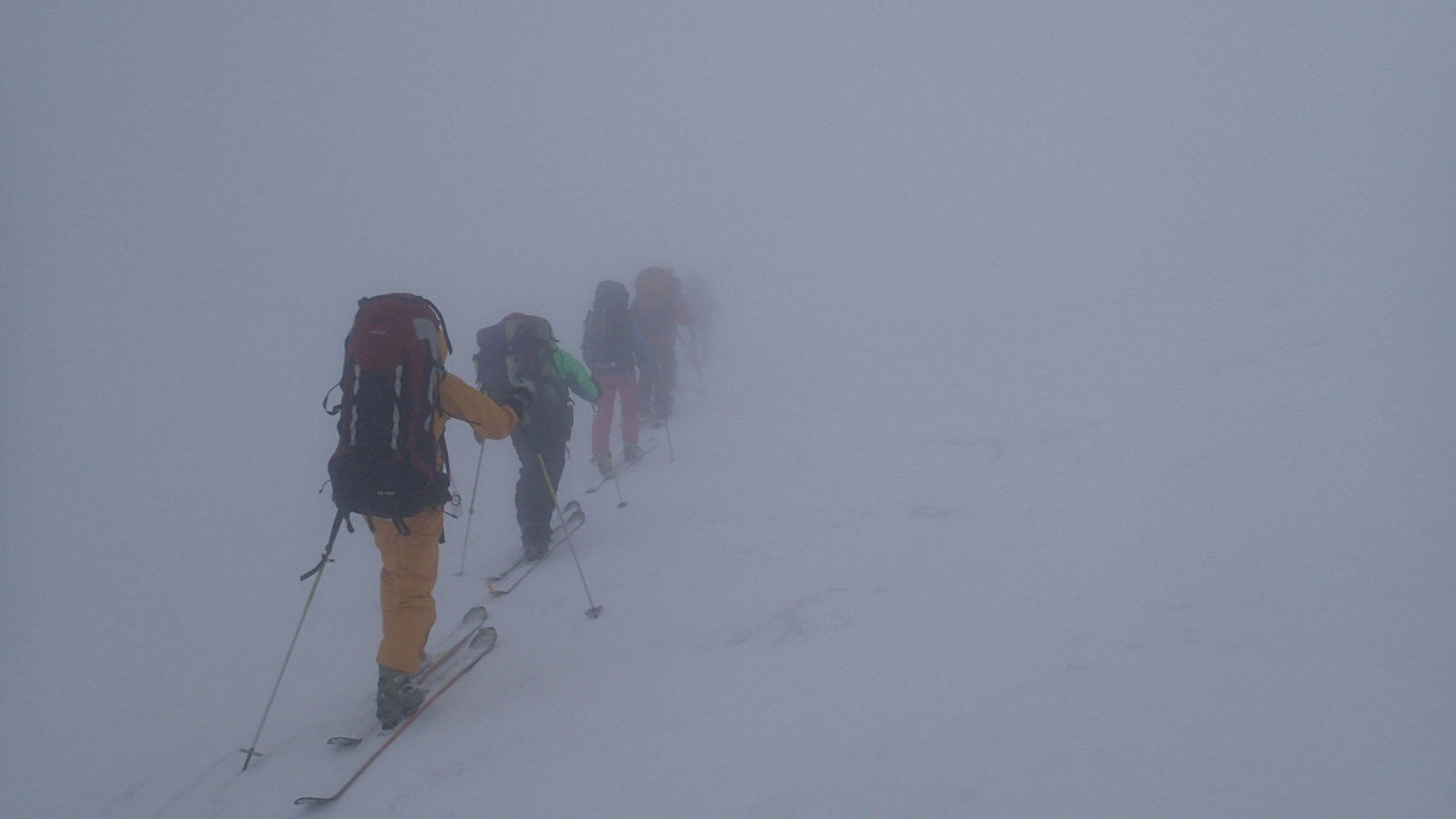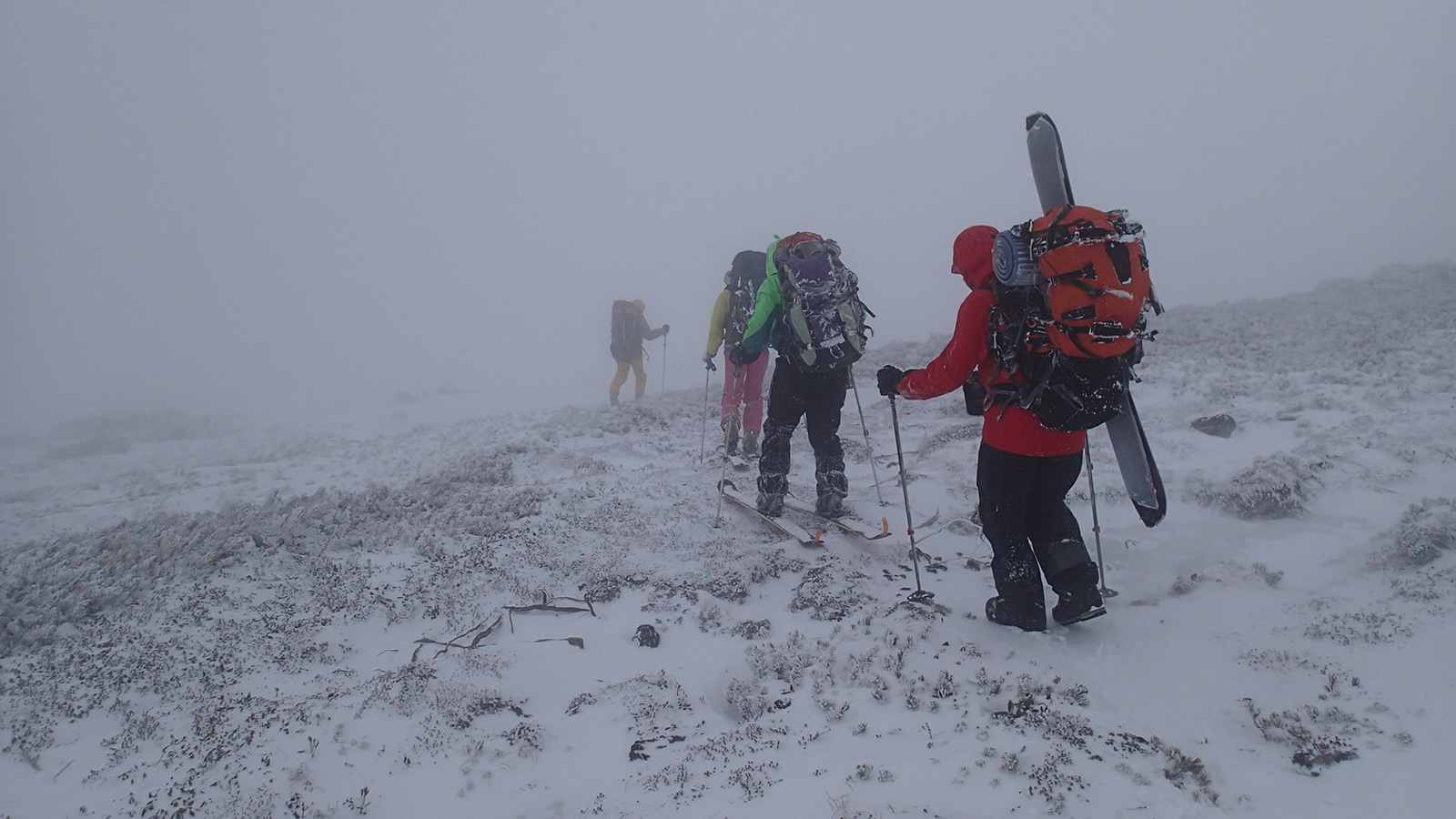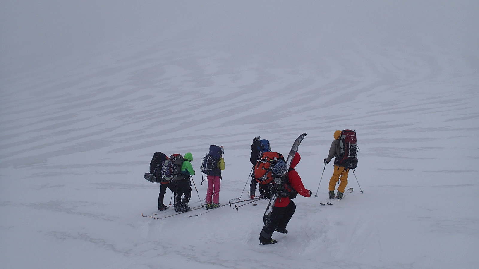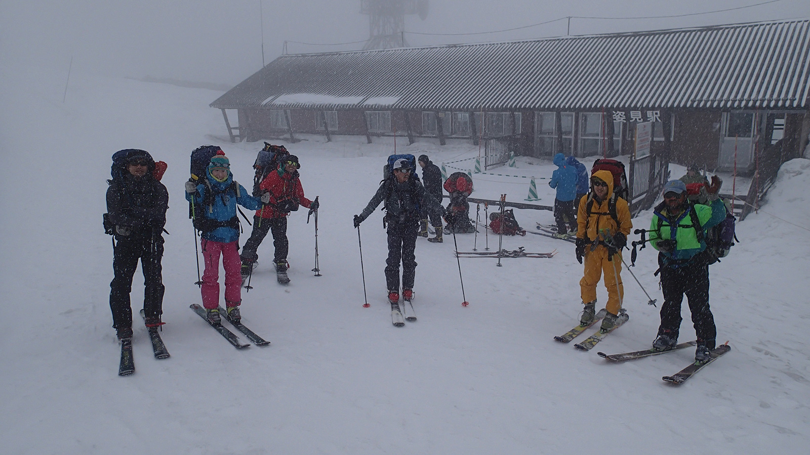2014年5月4日(日) 中岳温泉スキーツアー(吹雪のち星空)一日目 天候:雪のち晴れ 気温:-5度 風速:6〜7m/s 雪量:十分 雪質:融解凍結クラスト コース:旭岳ロープウェイ姿見駅10:00-中岳温泉12:50 メンバー:大西(CL)、田中パパ(SL)、タカヤ、T田、カズ、H本、まさりん 計7名