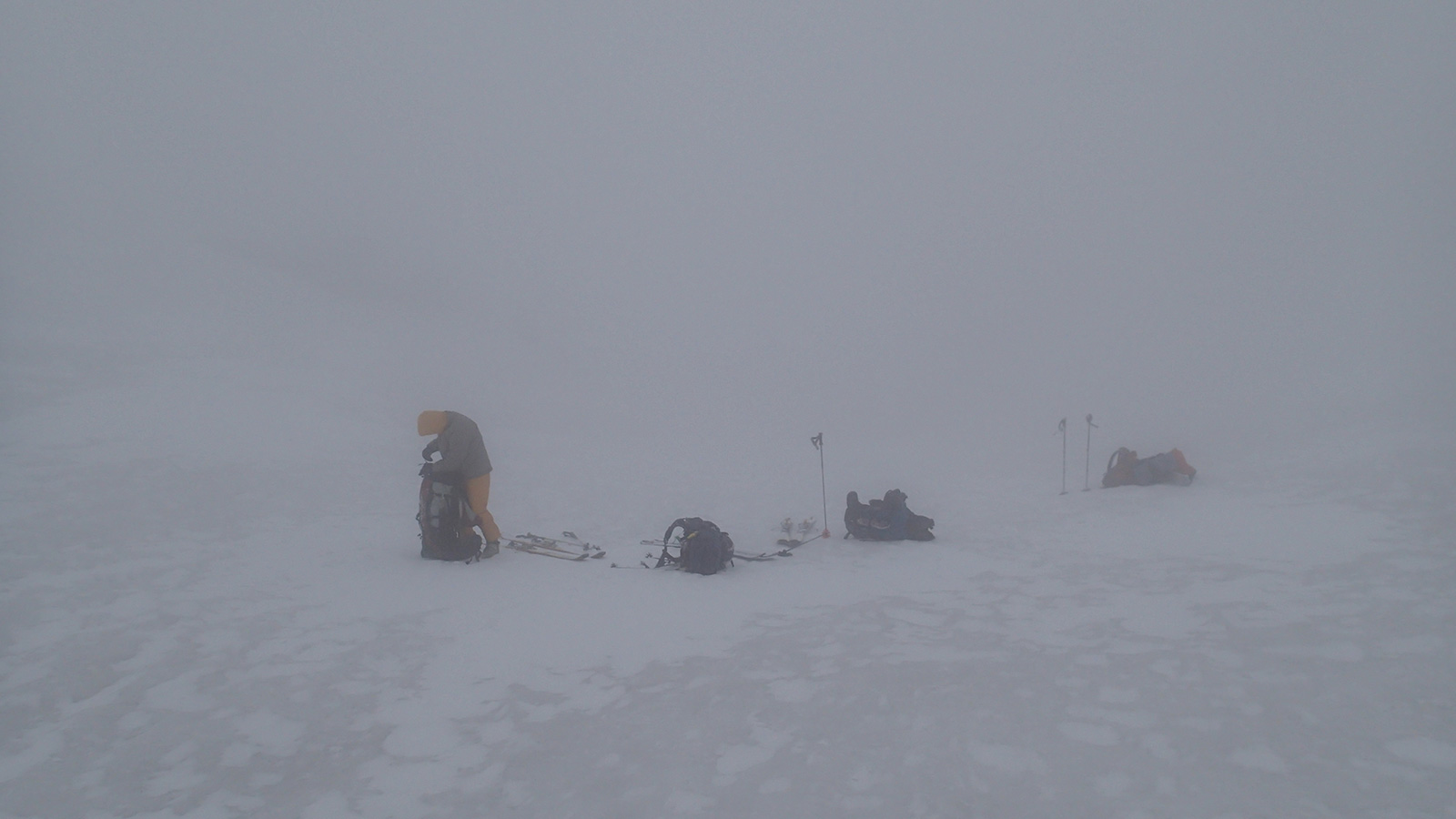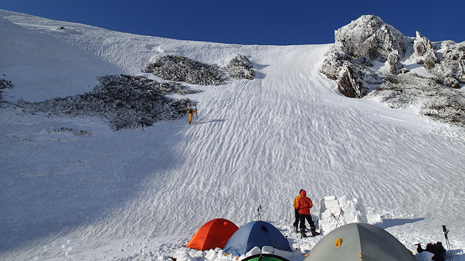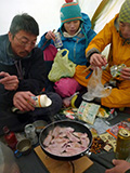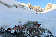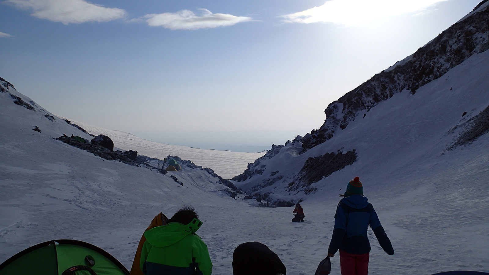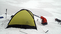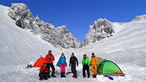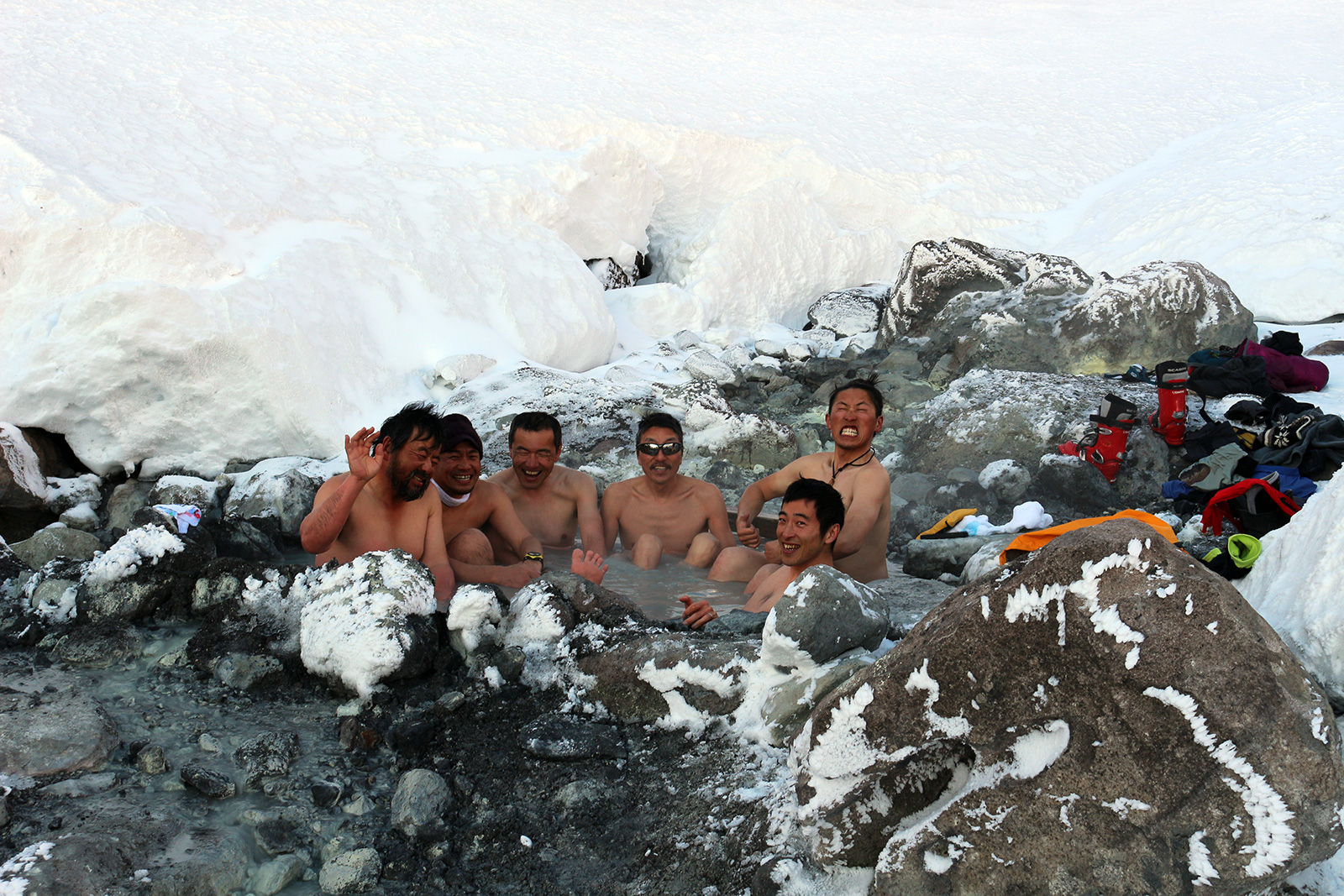 実に十年ぶりの中岳温泉ツアー。 旭岳温泉に向かう途中で雨が降ってきたが、その雨は標高900mあたりで雪に変わった。到着した旭岳は真っ白な雲に覆われていた。 駐車場で共通装備を配り出発準備。ロープウェイが強風で止まった場合は盤の沢での森林キャンプとする予定だったが、視界が悪い以外は問題無いと判断して予定通り出発。 だが、カズ君を山麓駅に忘れてきてしまうという問題が発生。カズ君が次の便で上がってくるまで姿見駅で待機することになった。これは、ロープウェイの運行時間を9:30としていたが、実際には9:20だったことと、リーダーが点呼を怠ったことが原因。 今回のツアーは、従来我々が得意としていたソリによる重量物運搬を廃して、全ての装備をザックに収めることにした。久しぶりの全荷が肩にずっしりとくる。でも、焼肉とビールを運んでいると思えば耐えられる。 姿見駅出発時の視界は10mのホワイトアウト。GPSとコンパスを用い、絶えず先頭と後続が連絡を取り合い進路を修正しながら進んだ。懸念された風は追い風で幸運だった。雪質は最悪の凍結融解クラストでガチガチ。ずっと片斜面をトラバースしているとスリップして辛い。特にスプリットボードのカズ君は大変だったと思う。 結局、3時間近くかかって中岳温泉に到着。すでに数パーティがテントを設営していた。 我々は、どうせ周りに迷惑を掛けるだろうと判断し、他のテントからかなり奥まったところにテント群&トイレを設営した。 天候さえ良ければ、日没まで安足間岳〜比布岳あたりに足を延ばして滑りを楽しむところなのだが、この視界と雪質では何もできない。必然的に真っ昼間から焼肉&酒宴となった。宴会場は30年もののICI4-5人用テント。ここに7人が入って、延々と酒を酌み交わす。狭いので、お互い背中に寄りかかったり、隣の人の腰や足に寝転がったり・・この狭さがテントらしくて心地よい。そのうち、いつの間にか風の音が止み、ベンチレーションから外を覗くと青空になっていた。 酔っ払った僕らは、歓声を上げながら近場の急斜面を登って滑って滑落したり、雪の上で裸になり露天風呂に浸かった。久しぶりの露天風呂は、深さ、広さ、湯温共に申し分なく快適だった。 最後に高台に登り、全員で夕陽を堪能した。夕陽も、そこへ向かって滑るテレマーカーの姿も感動的に美しかった。 そして、また宴会。1人300gを用意した肉は、食べても食べても無くならない。ビールが尽きて濃い酒に切り替わる。 そのうち、いつの間にか暗くなり、外を覗くと満天の星空になっていた。ホワイトアウトから快晴〜星空へ。劇的に変化する天候に僕らは打ちのめされ、感動し、感謝した。 明日の滑りに期待しながら、酔いつぶれて眠る・・